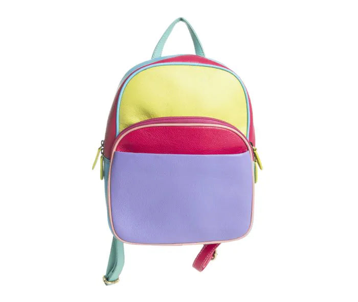 You'll love this vibrant burst of joy for your everyday adventures! This compact yet spacious backpack features a delightful color-block design in a playful range of great colors. With multiple compartments, it's the perfect blend of style and function for the modern woman who loves to make a colorful statement. Matching carrying and shoulder straps are in coordinated leather. Just fun!