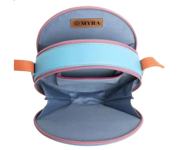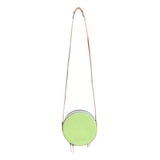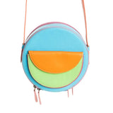Splendor, pure and simple! This playful round shoulder bag adds a burst of joy to any outfit. This compact yet surprisingly roomy accessory features a delightful color-block design in refreshing vivid colors. With its clever interior organization, it's the perfect blend of fun and function for the modern woman on-the-go. Zipper-close top with detachable, adjustable shoulder strap in matching leather.