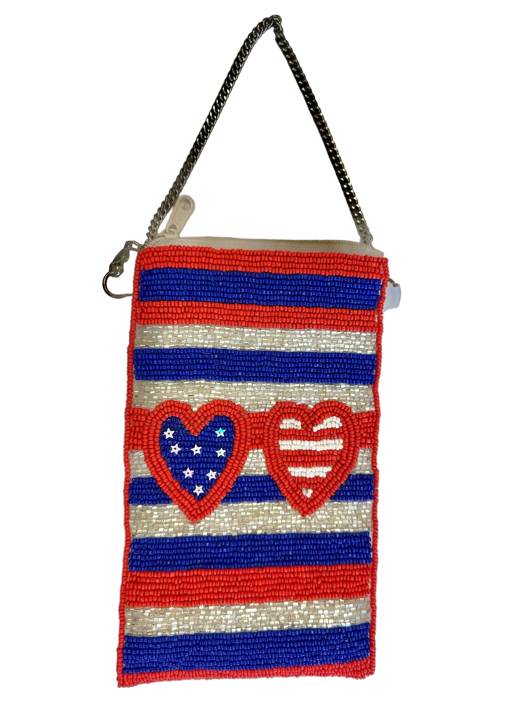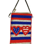 Show off your love for America with our Heart Coin Purse! This quirky silver purse features red and blue stripes, with 2 hearts showcasing the American flag. Keep your coins secure in style and make a patriotic statement at the same time. Perfect for the playful and proud American.