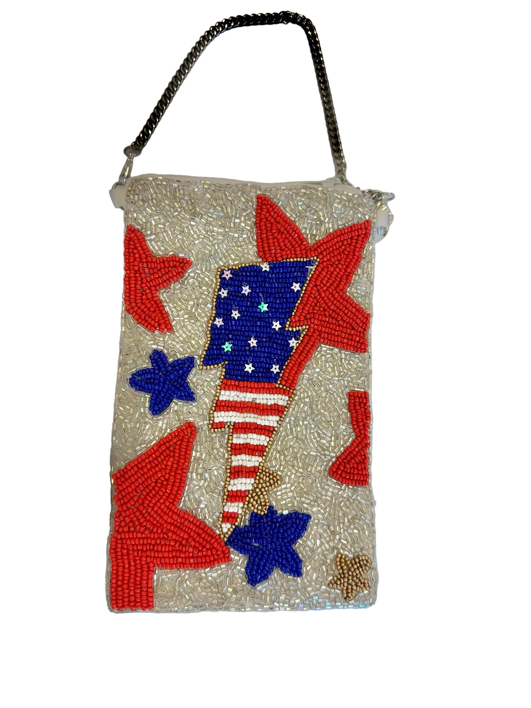 Stay on trend with the Lightning Bolt Coin Purse. This large silver coin purse features a playful design of gold, blue and red stars and a flag lightning bolt. Plus, the beaded detailing adds a touch of fun and whimsy to your daily essentials. Perfect for keeping your coins organized and showing off your unique style!