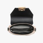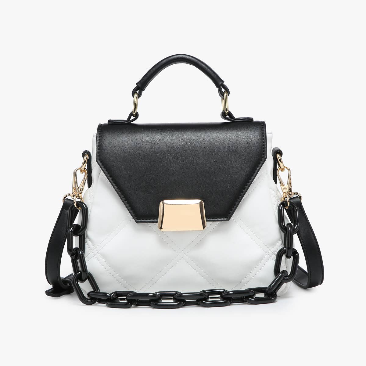 Designed for day-to-night wear, this crossbody includes a sleek top handle for a classic satchel-inspired look and an adjustable, removable strap for comfortable, hands-free styling. A detachable acrylic chain accent adds a bold, modern edge, while gold-tone hardware provides a touch of shine. Inside, convenient slip and zip pockets help keep everything in its place. Compact yet functional, this bag is the perfect finishing touch for casual outings, brunch dates, or evening plans.