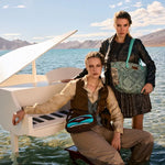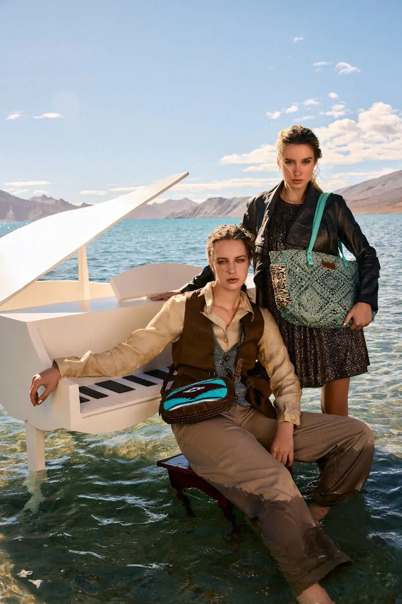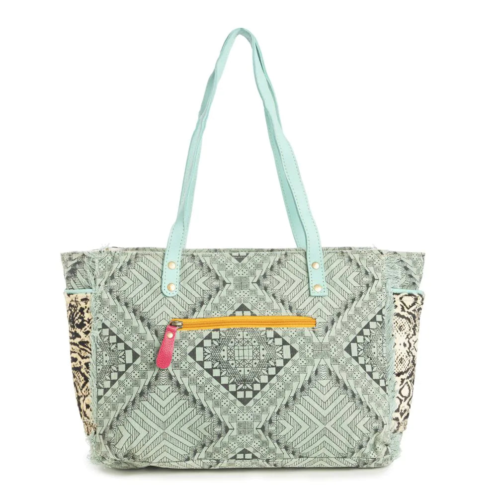 This great weekender bag is a perfect blend of style and sustainability. This upcycled canvas features an intricate sage green geometric print, accented with chic turquoise handles and snakeskin-inspired side panels. Spacious yet fashionable, it's ideal for weekend getaways or as a statement everyday bag. Frayed edge treatments finish the look. Embrace eco-conscious fashion with this unique piece that combines artisanal charm and modern flair for the free-spirited woman.