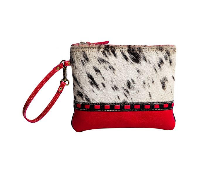 This lovely bag will be your sure favorite. It features a beautiful hair-on hide front, accented perfectly with sumptuous hot pink leather, trimmed with stitched ebony leather accents. Zipper-close top. The back is smoky charcoal. The durable wristlet carrying strap is in matching hot pink leather.
