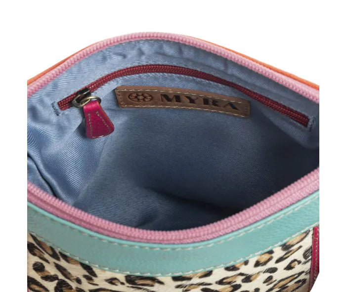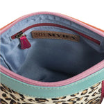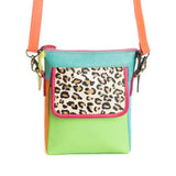 Where vibrant style meets practical design, this eye-catching bag features a playful mix of leopard print and bold colors, perfect for the adventurous fashionista. With its multiple compartments, and compact size, it's your go-to accessory for adding a pop of personality to any outfit. Zipper-close top with detachable, adjustable shoulder strap in coordinated leather.