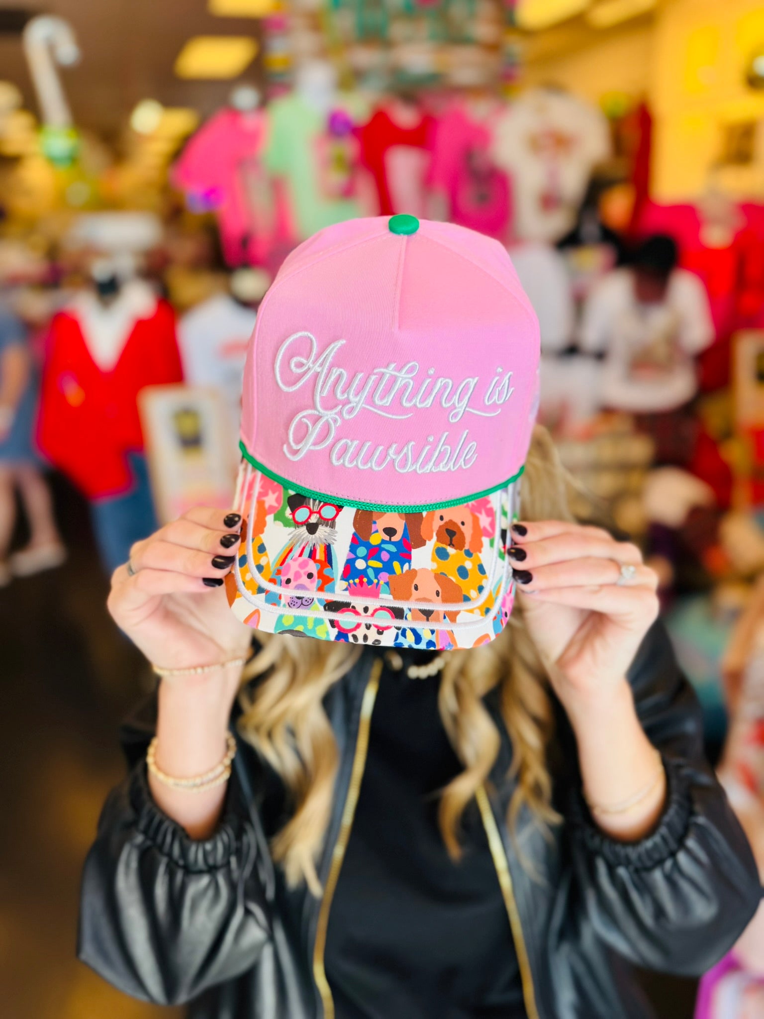 Spread pawsitivity everywhere you go with the Anything’s Pawsible Hat, a playful and uplifting accessory made just for animal lovers. Crafted from durable canvas and embroidered with care, this pink hat features the inspiring phrase “Anything Is Possible” across the front, reminding you that life’s better with a wag and a smile. The side reads “No Ruff Days”, while the back showcases cheerful smiley faces, stars, and paw prints, adding a fun, lighthearted touch. Designed with a breathable fit and adjustable closure, it’s perfect for daily wear, gifting, or showing off your love for furry friends. Each hat is one-of-a-kind, with pattern placement on the bill varying by fabric cut, giving it a uniquely charming finish.