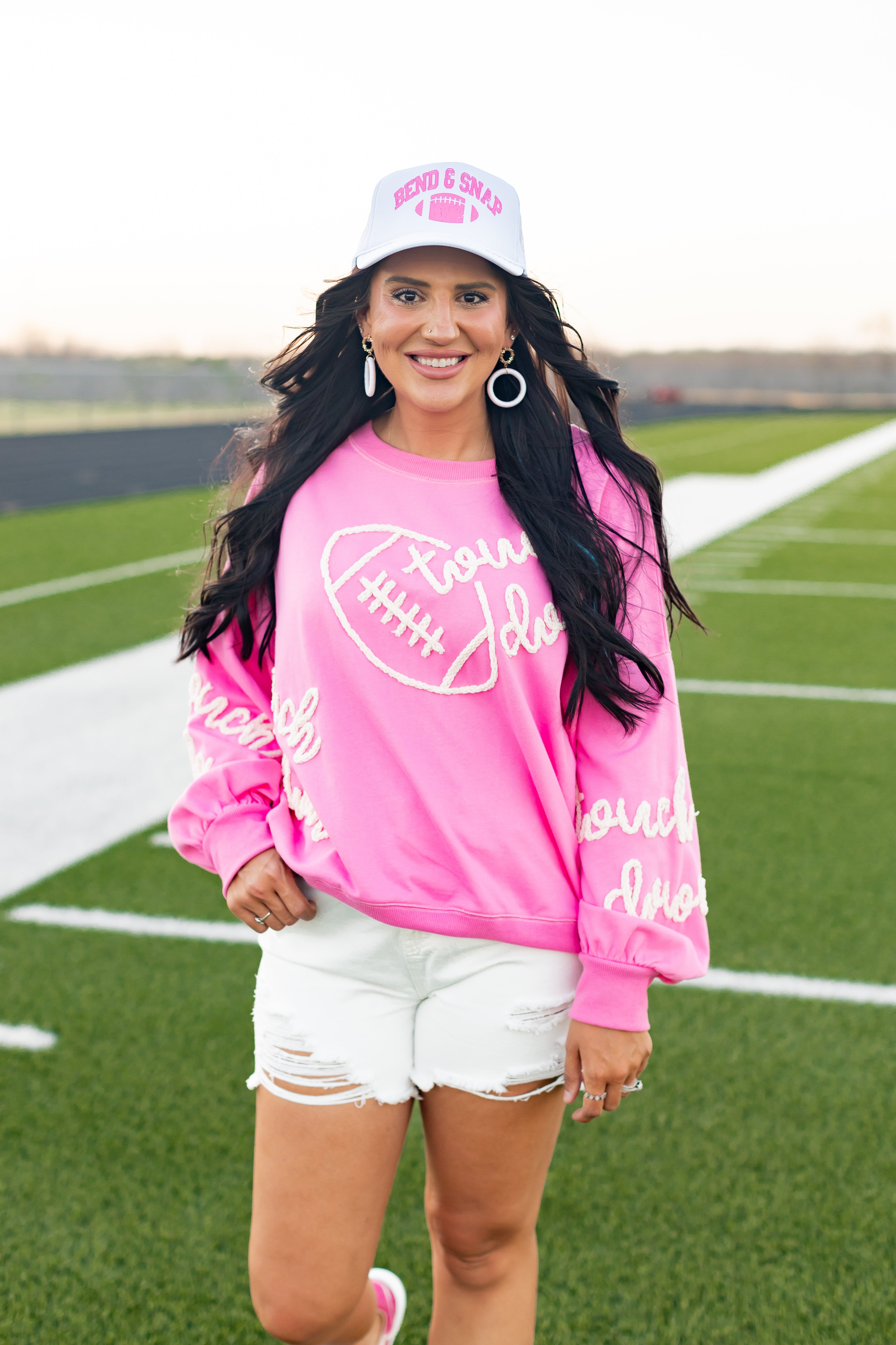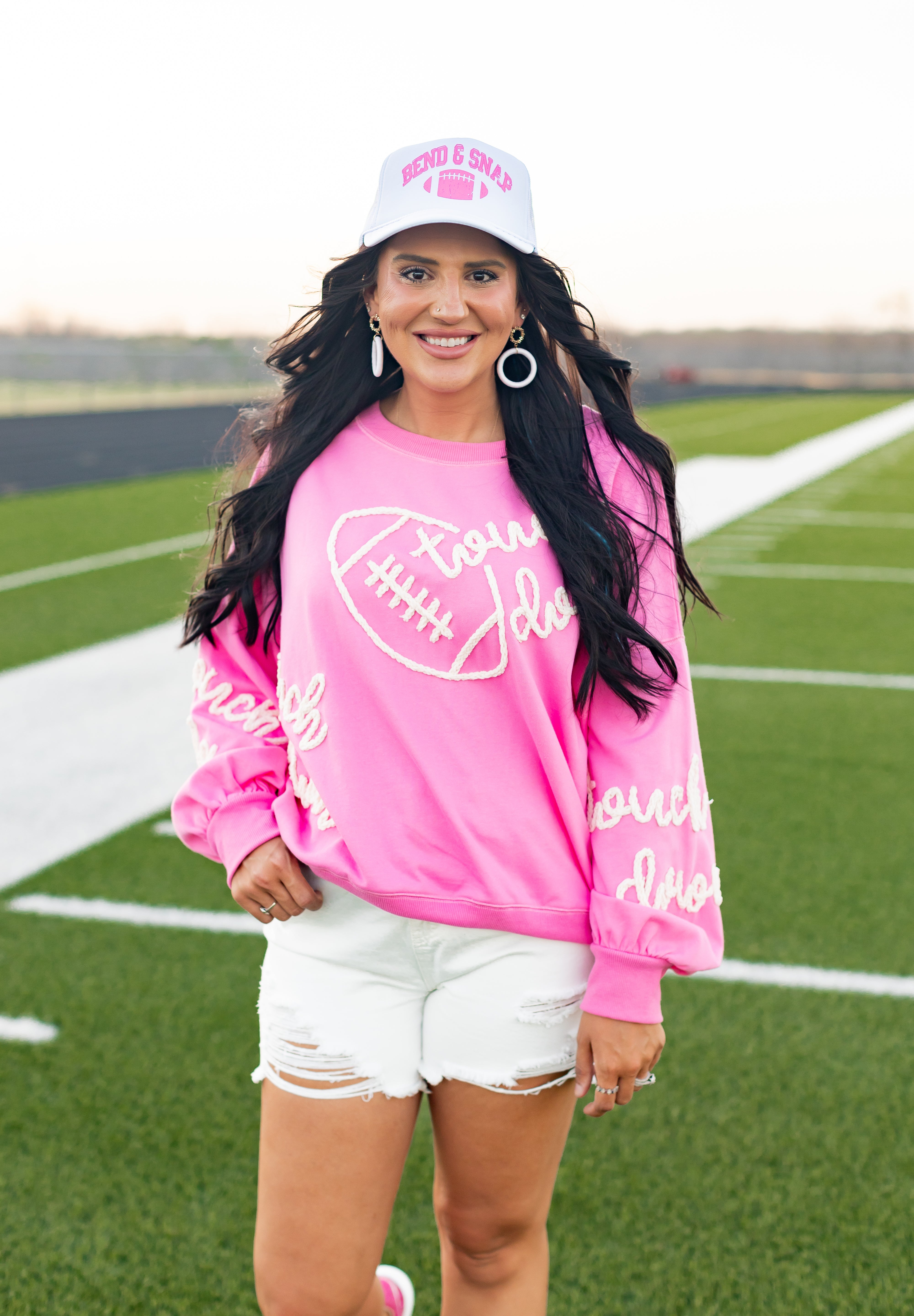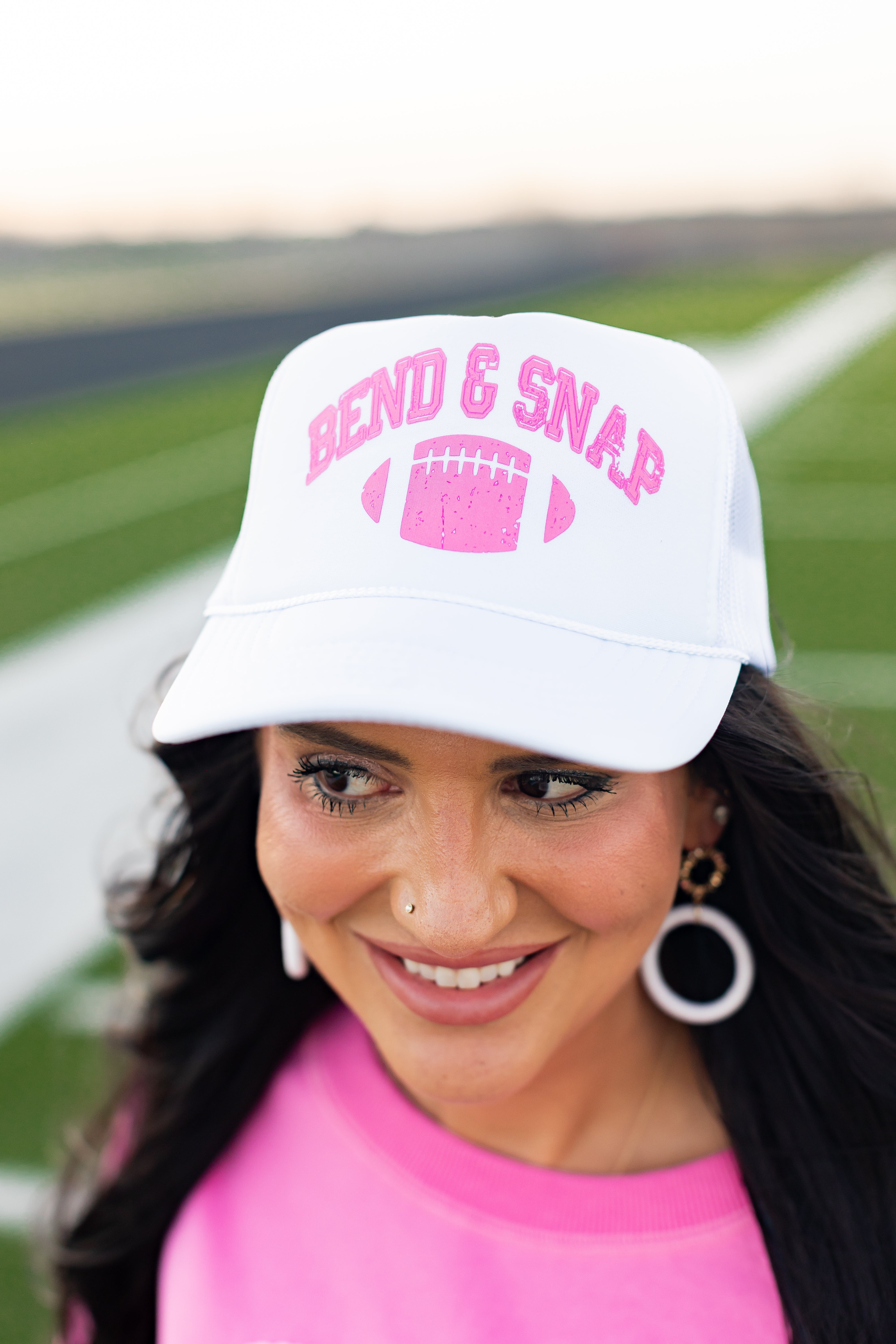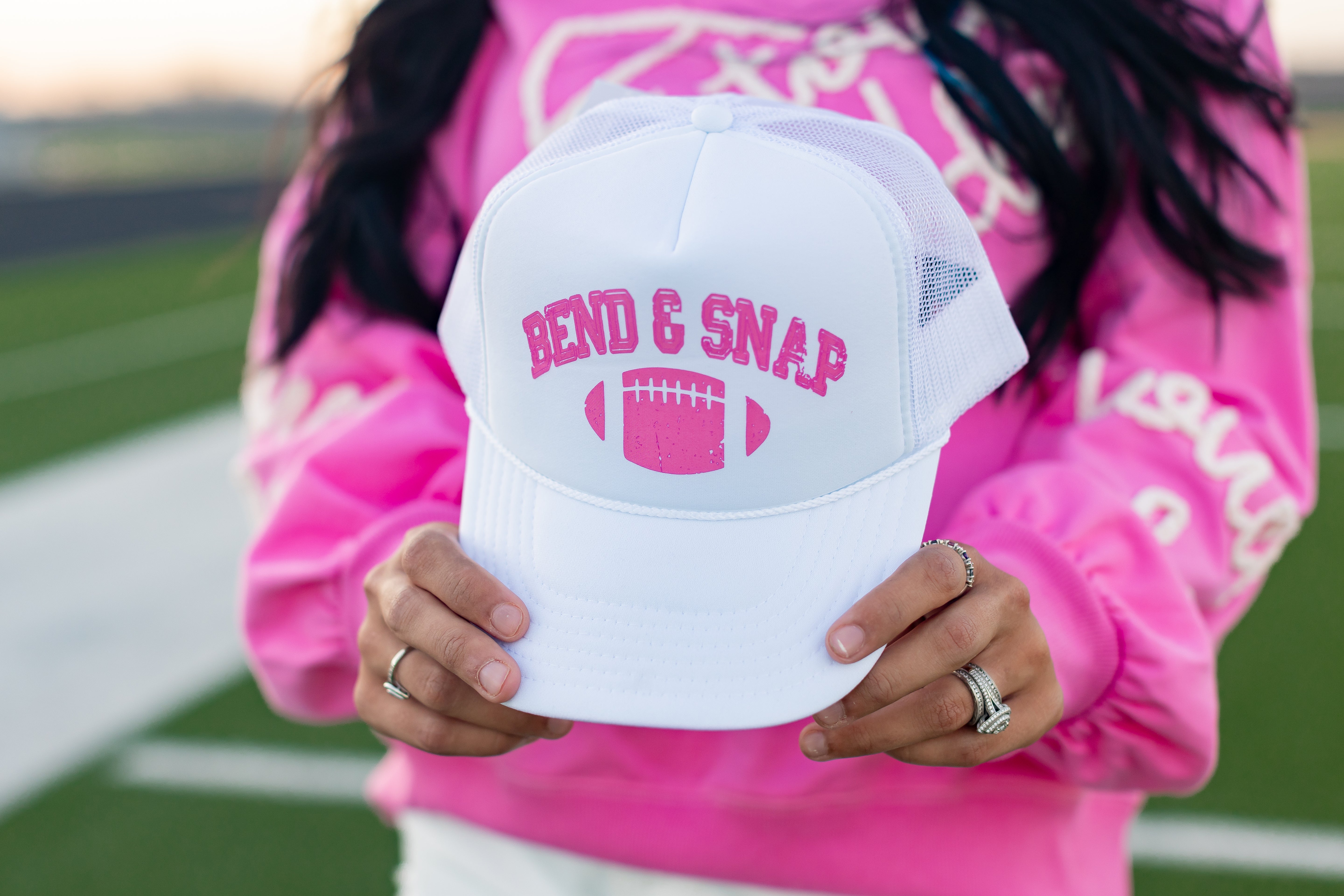 The Bend & Snap Trucker Hat is a game day essential! With its white foam trucker hat design and playful pink graphics, it's the perfect way to top off your look and show off your personality. Don't get caught without this game day perfection!