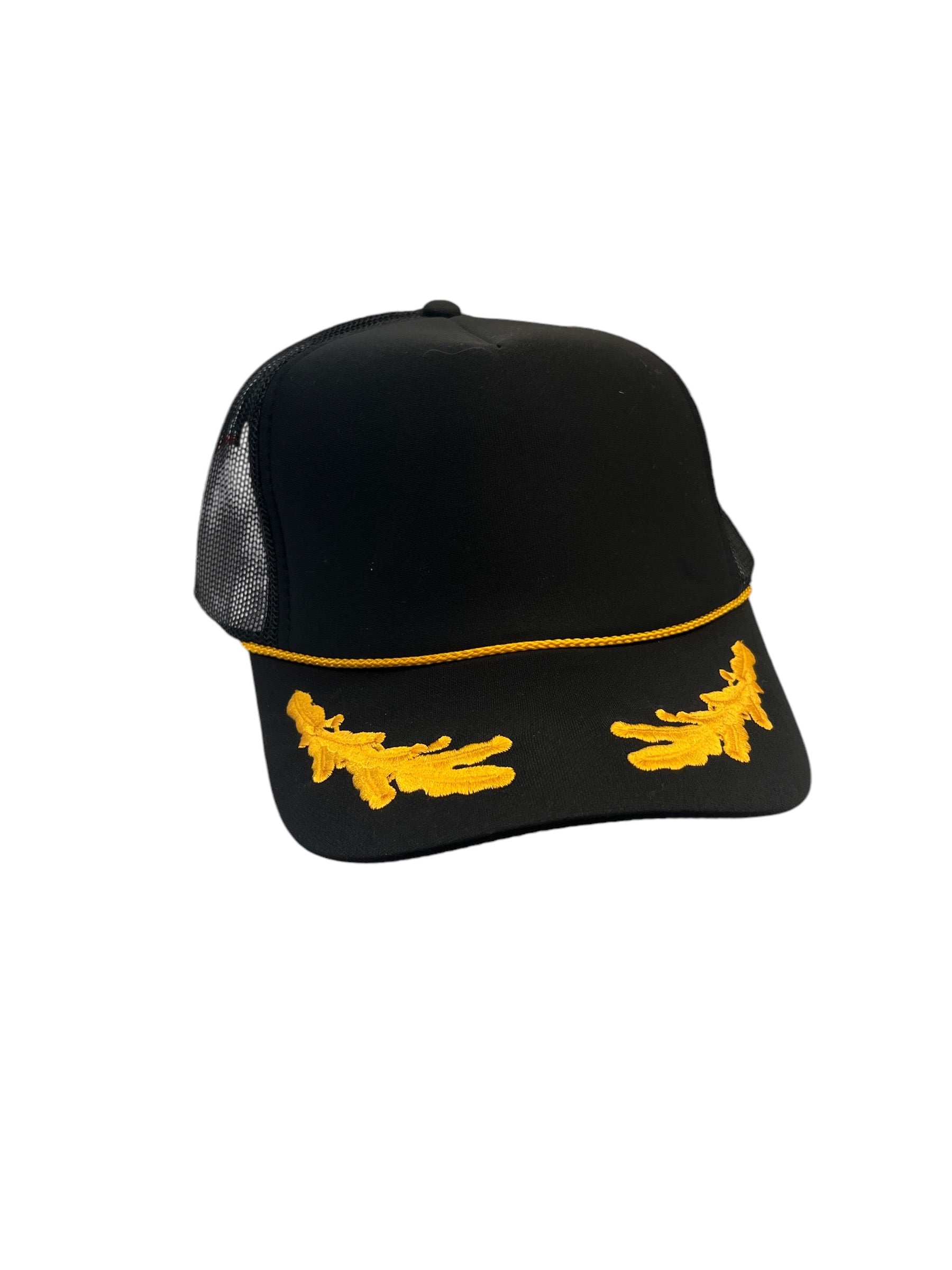 Rule the high seas of fashion with our Black Captain Foam Trucker Hat. Featuring an embroidered bill and a flashy gold rope accent, this foam front trucker hat is both stylish and comfortable with its mesh back and adjustable snapback enclosure. Add some of our unique patches for a personalized look. Don't miss out on this must-have accessory!