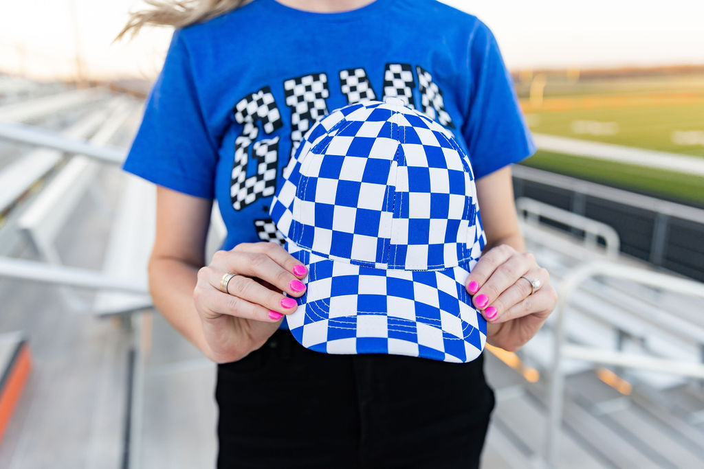Get ready to win in style with our Blue Checkered Trucker Hat. The checkered print adds a unique twist to your game day look, making you stand out from the crowd. Don't just blend in, make a statement with this winning combination!