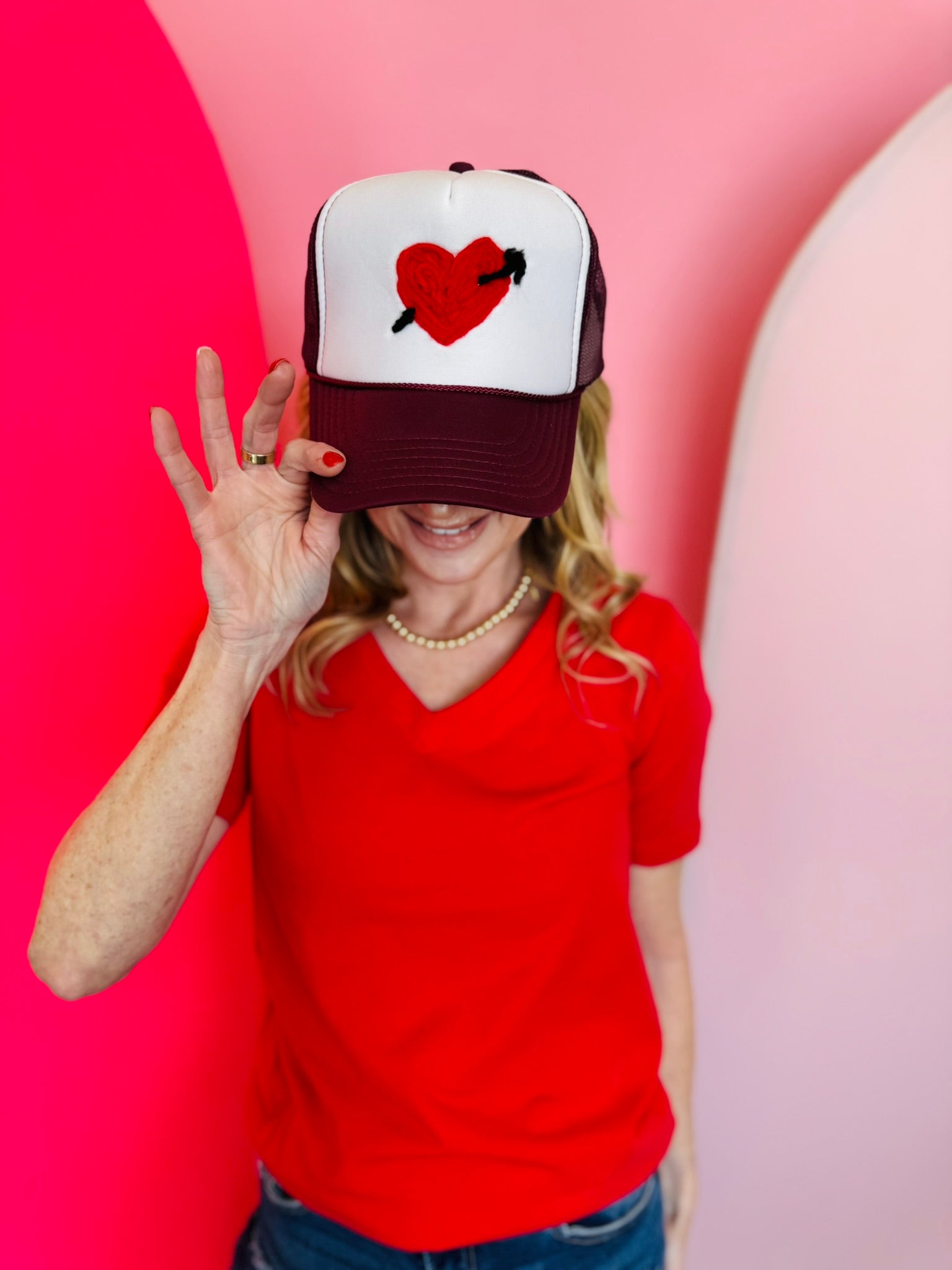 Add a charming touch to your everyday style with the Mavis Heart & Arrow Yarn Embroidered Cap. This classic cap features a rich maroon front paired with a crisp white mesh back, creating a timeless trucker-inspired look that’s both stylish and breathable. The standout detail is the heart and arrow design, beautifully yarn embroidered on the front panel, adding texture, personality, and a playful romantic flair.