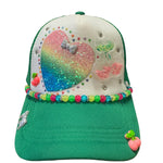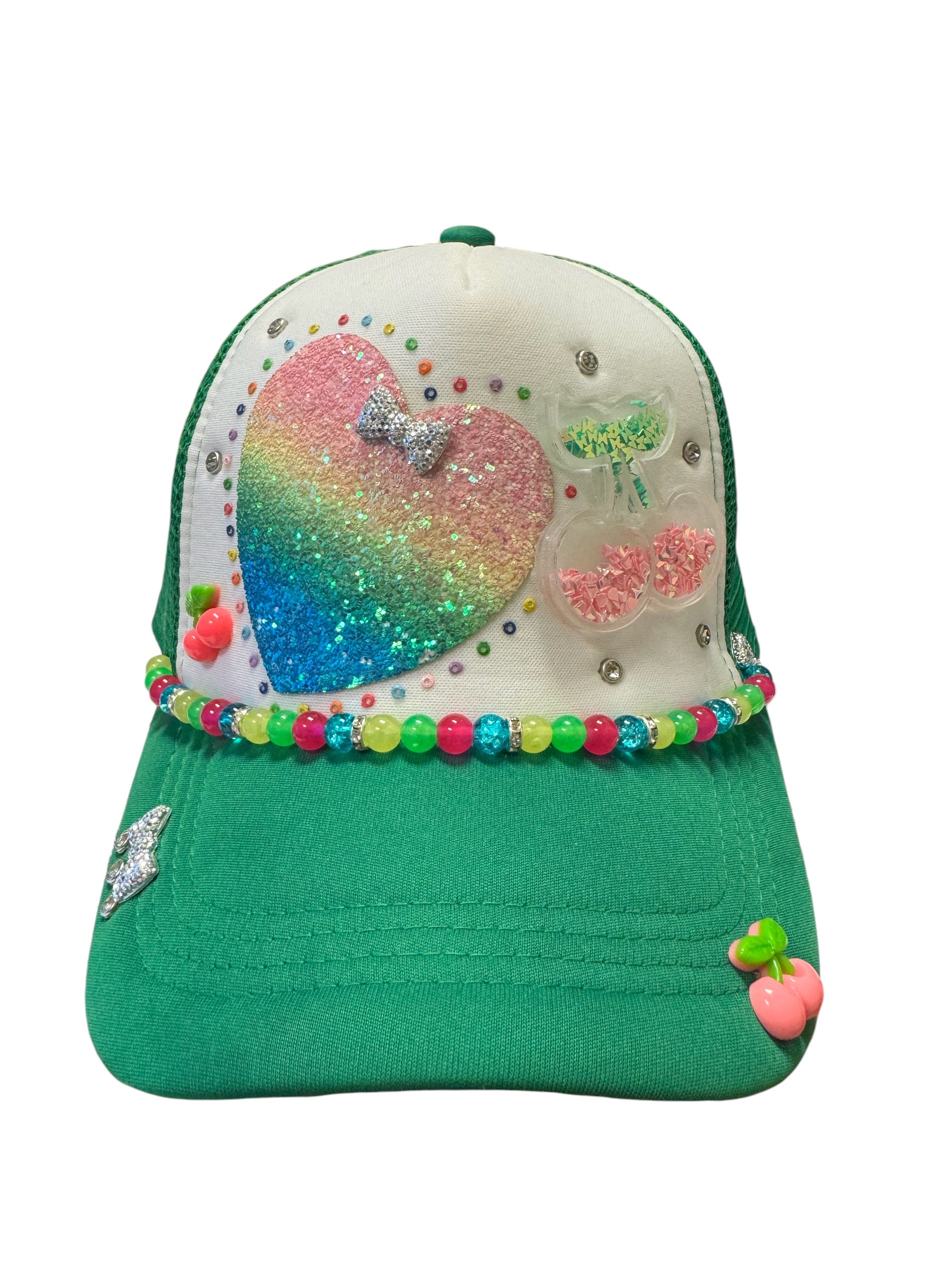 Get ready to rock the latest trend with our Cherries Trucker Hat! This green and white foam hat is adorned with cherry patches, charms, and a stylish hat chain. It's the perfect accessory to add some fun and flair to any outfit. Don't miss out on the hottest trend of the season!