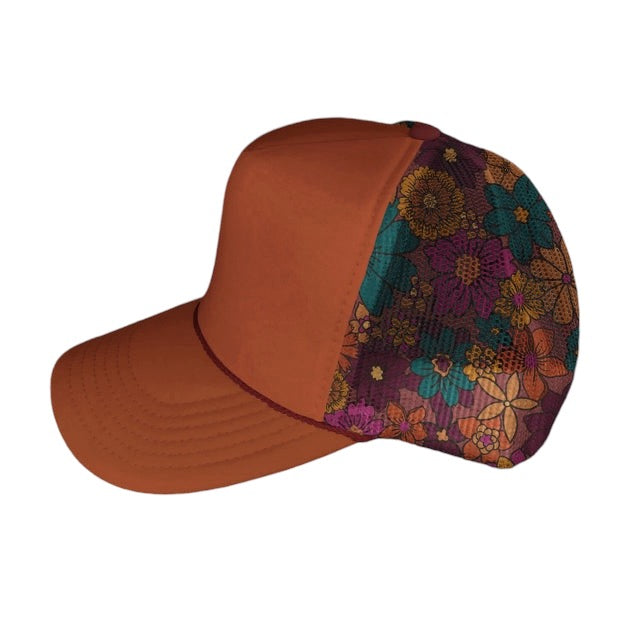 Elevate your hat bar game with this printed mesh back cap! This rusty orange color plus floral is the perfect combination for fall!