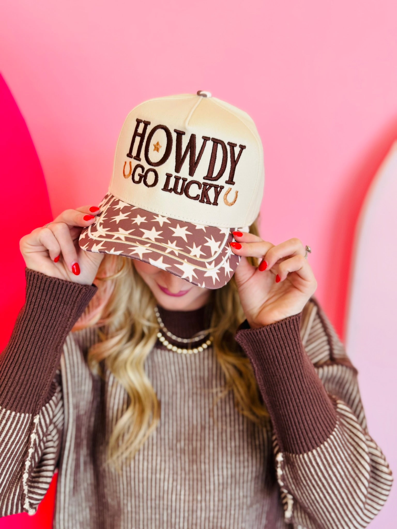 Say hello to good vibes with the Howdy Go Lucky Hat! This cream-colored cap is a stylish and cheerful addition to any casual outfit. Featuring bold, embroidered “Howdy Go Lucky” lettering in a warm brown tone across the front, this hat radiates positivity and playful charm. The bill stands out with its star accents, adding a touch of fun and whimsy to the design. Whether you’re running errands or enjoying a sunny day outdoors, the adjustable snapback closure ensures a perfect fit for all-day comfort. This hat is the perfect accessory for those who want to stay stylish while keeping their mood high and bright.