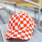 Add a playful touch to your game day outfit with the Orange Checkered Trucker Hat. This quirky hat features a fun checkered print that is sure to turn heads. Perfect for those who don't take themselves too seriously. (Score a fashion winning goal with this hat!)