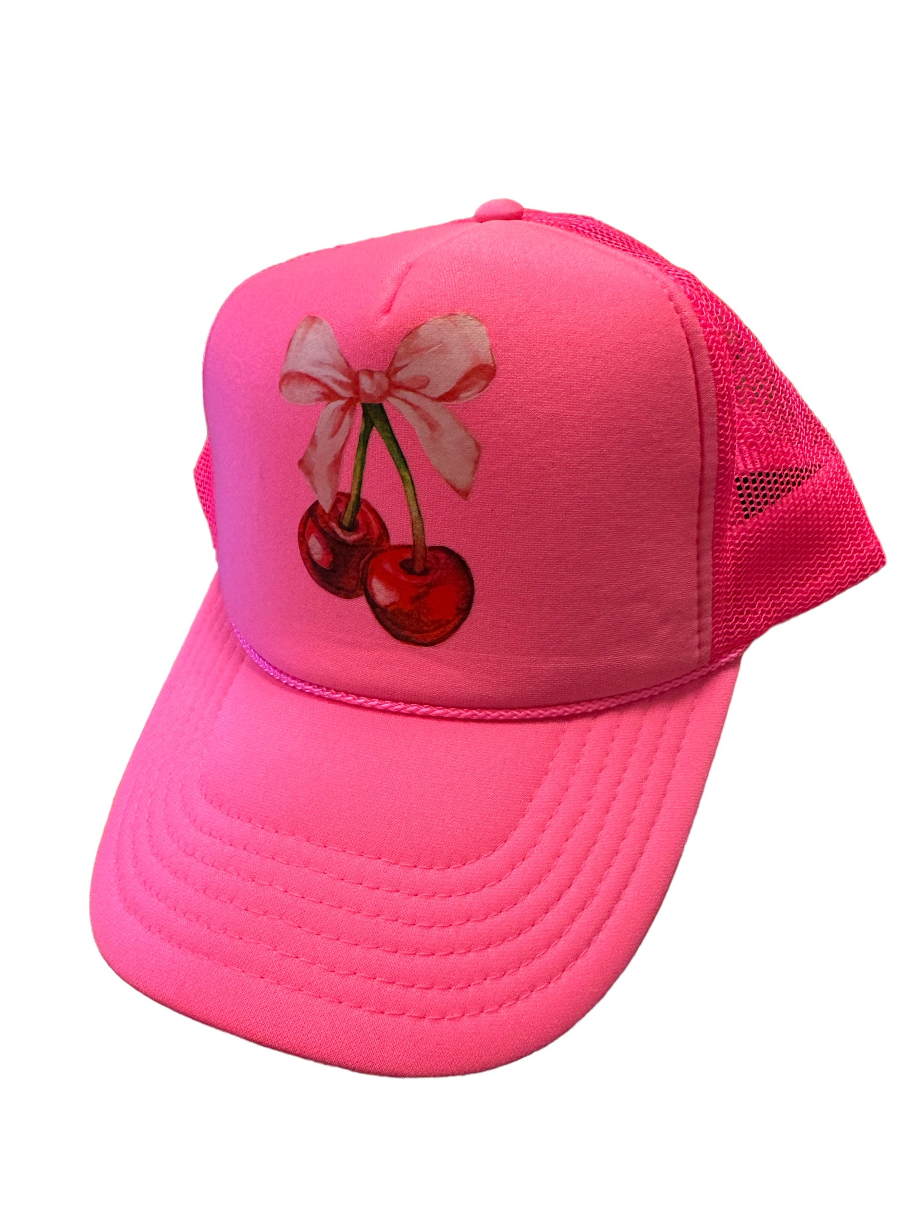 Handmade in Georgia, CandyCo Caps presents the Pink Bow & Cherry Trucker Hat! With its 100% polyester foam front and 100% nylon mesh back, this hat is both comfortable and adjustable, making it a perfect fit for anyone. The trendy trucker style adds a flattering touch to any outfit. Get ready for your next girl's trip!