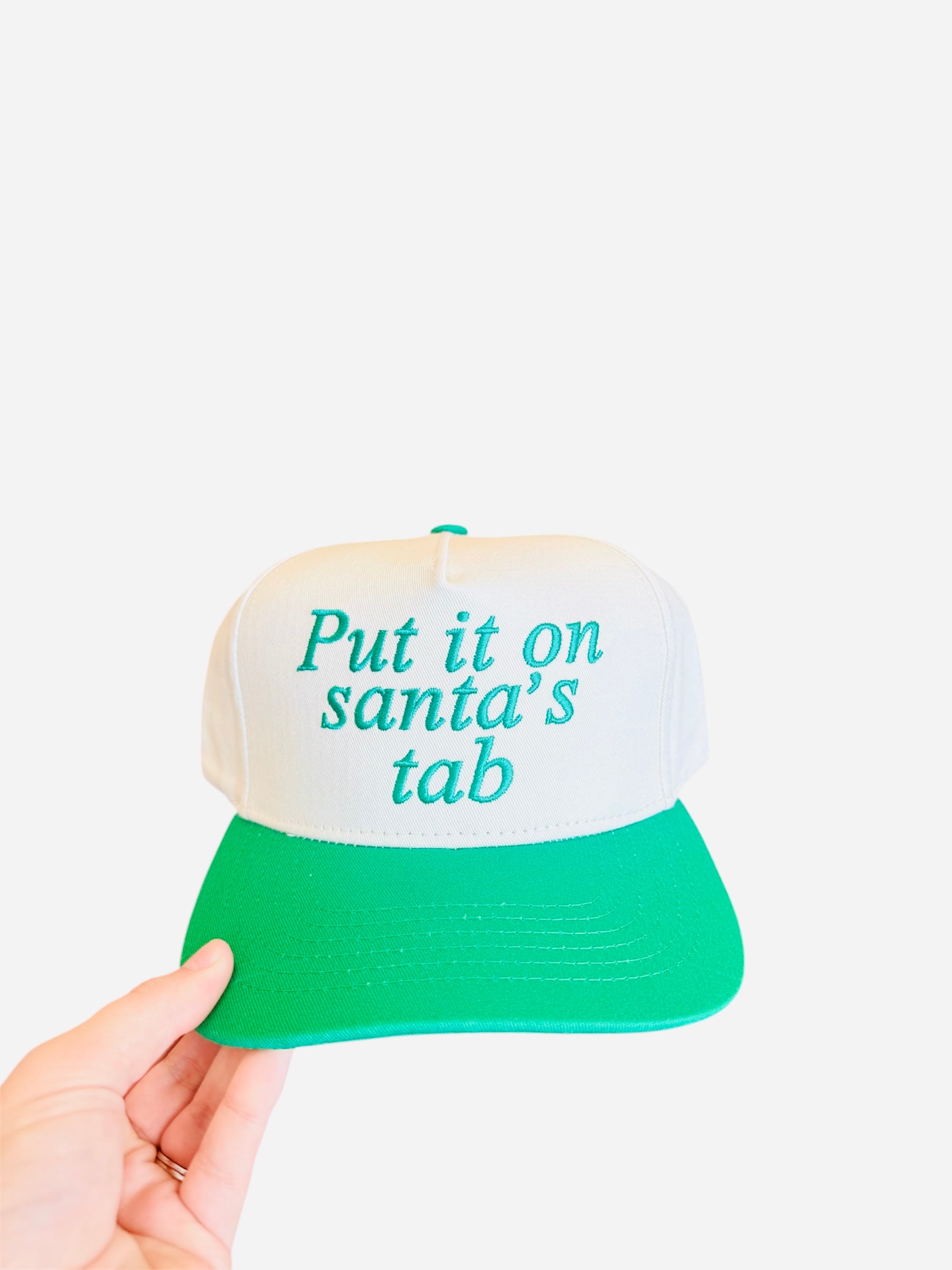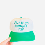 Red and green baseball hats with “Put It On Santa’s Tab” embroidery, festive Christmas accessory.