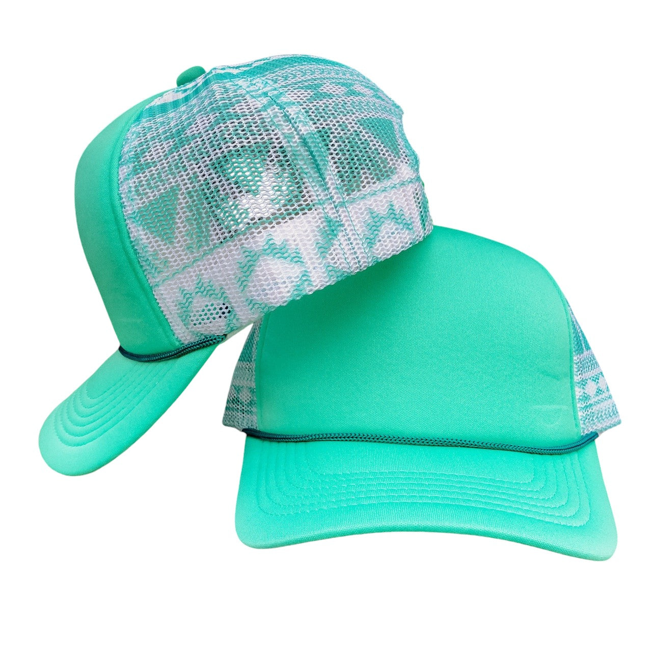 Rev up your style with our Teal Aztec Truckers Hat! This foam cap features a bold teal and white Aztec print on the mesh back for added ventilation. Perfect for any adventure, this versatile hat adds a touch of fashion to your outdoor look.