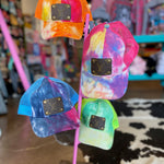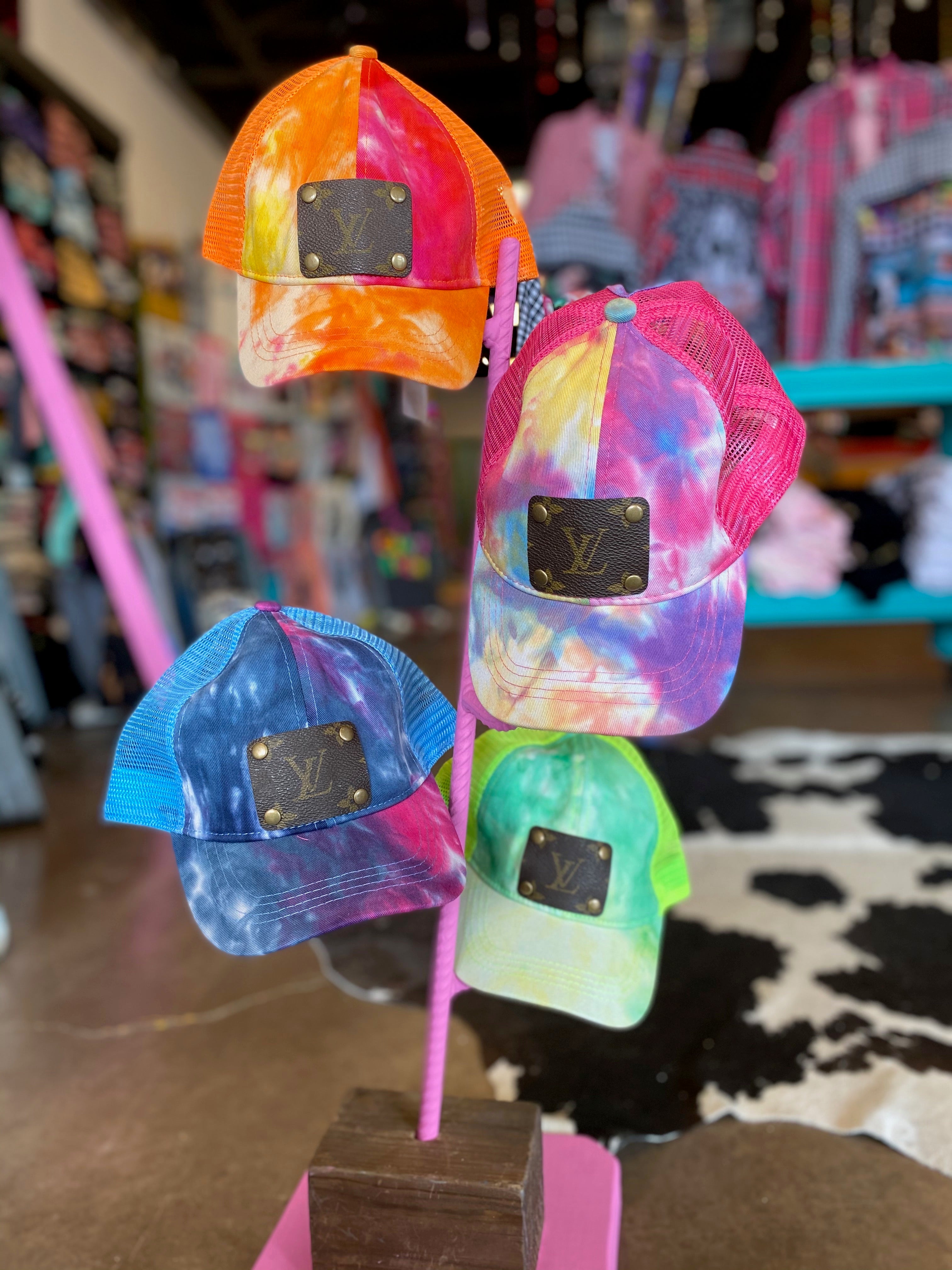 Gorgeous, bright tie dye caps with authentic upcycled LV patch.