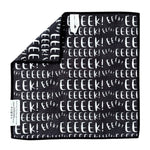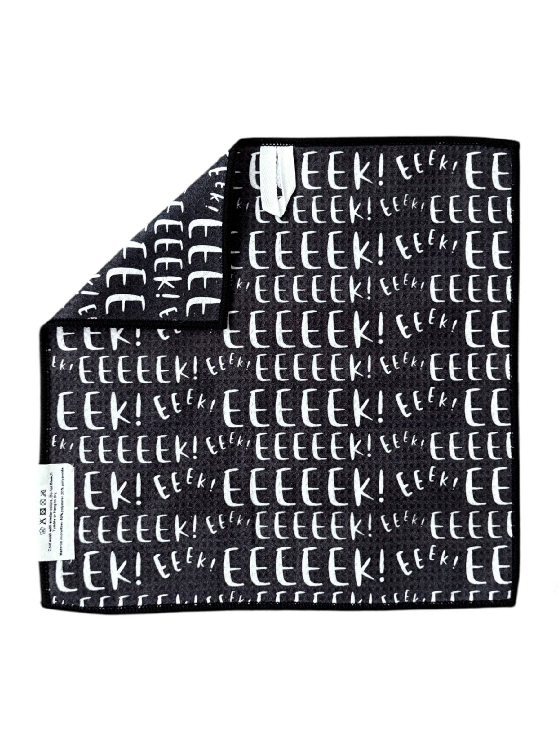 EEEEEk microfiber washcloth, 12x12 in, black with repeating white “EEEEEk” Halloween lettering.