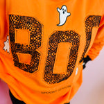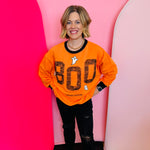 Celebrate spooky season in cozy, playful style with the Halloween Spooky Face Ghost Sweatshirt. Crafted in festive orange with striking black accents at the neckline, cuffs, and hemline, this sweatshirt delivers standout Halloween spirit. The front showcases adorable appliqué ghosts paired with a unique cobweb appliqué on the word “BOO”, creating a fun, textured design that’s perfect for parties, trick-or-treating, or casual fall days. The relaxed fit makes layering easy, while the soft fabric keeps you warm and comfortable. Pair it with jeans, leggings, or a seasonal skirt for an instant Halloween-ready outfit that combines comfort with bold, eye-catching detail.