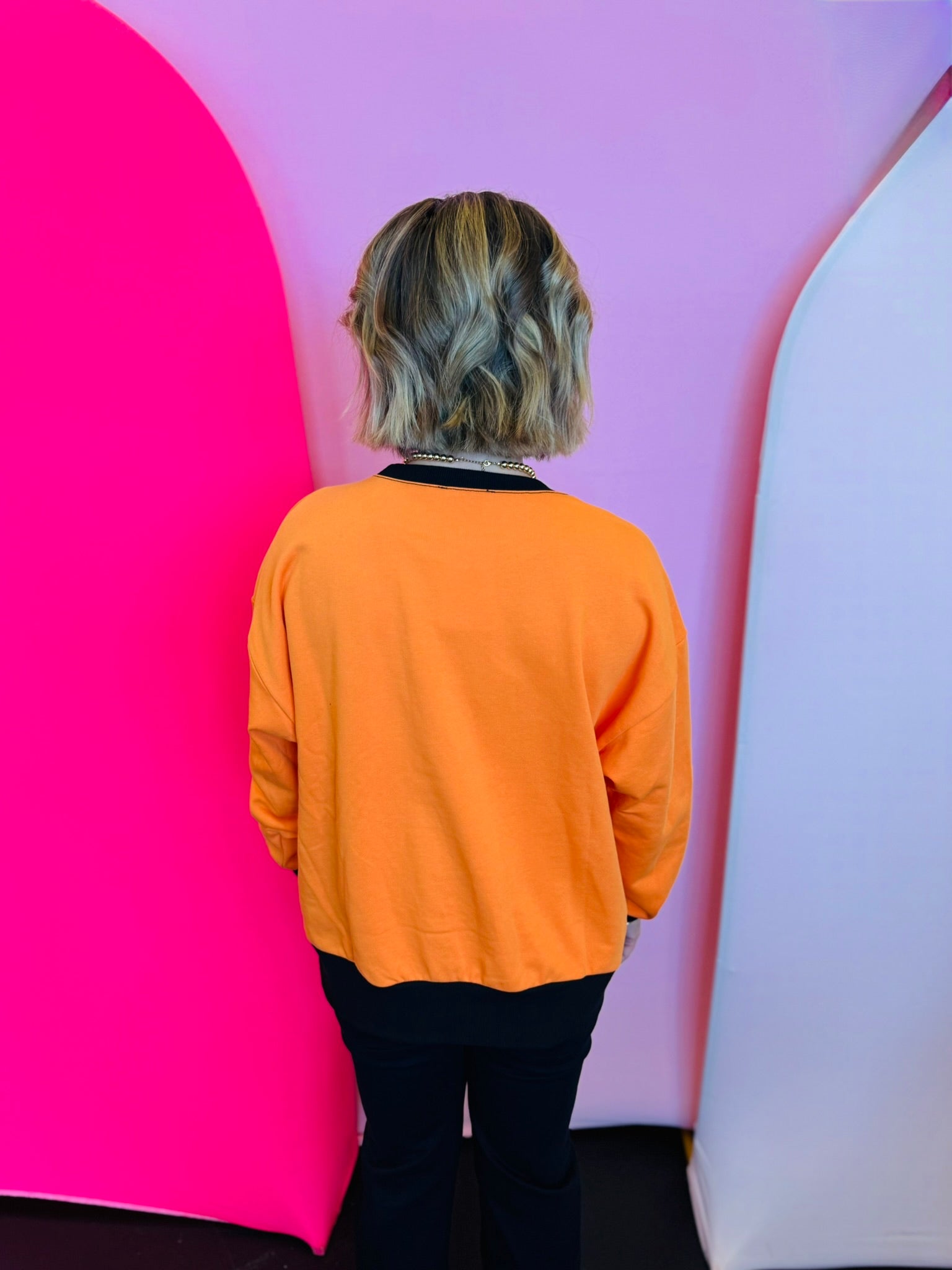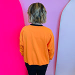Bright orange sweatshirt with black contrast neckline, cuffs, and hemline
