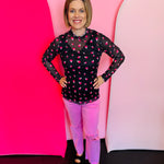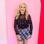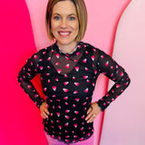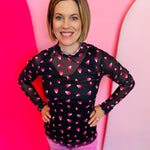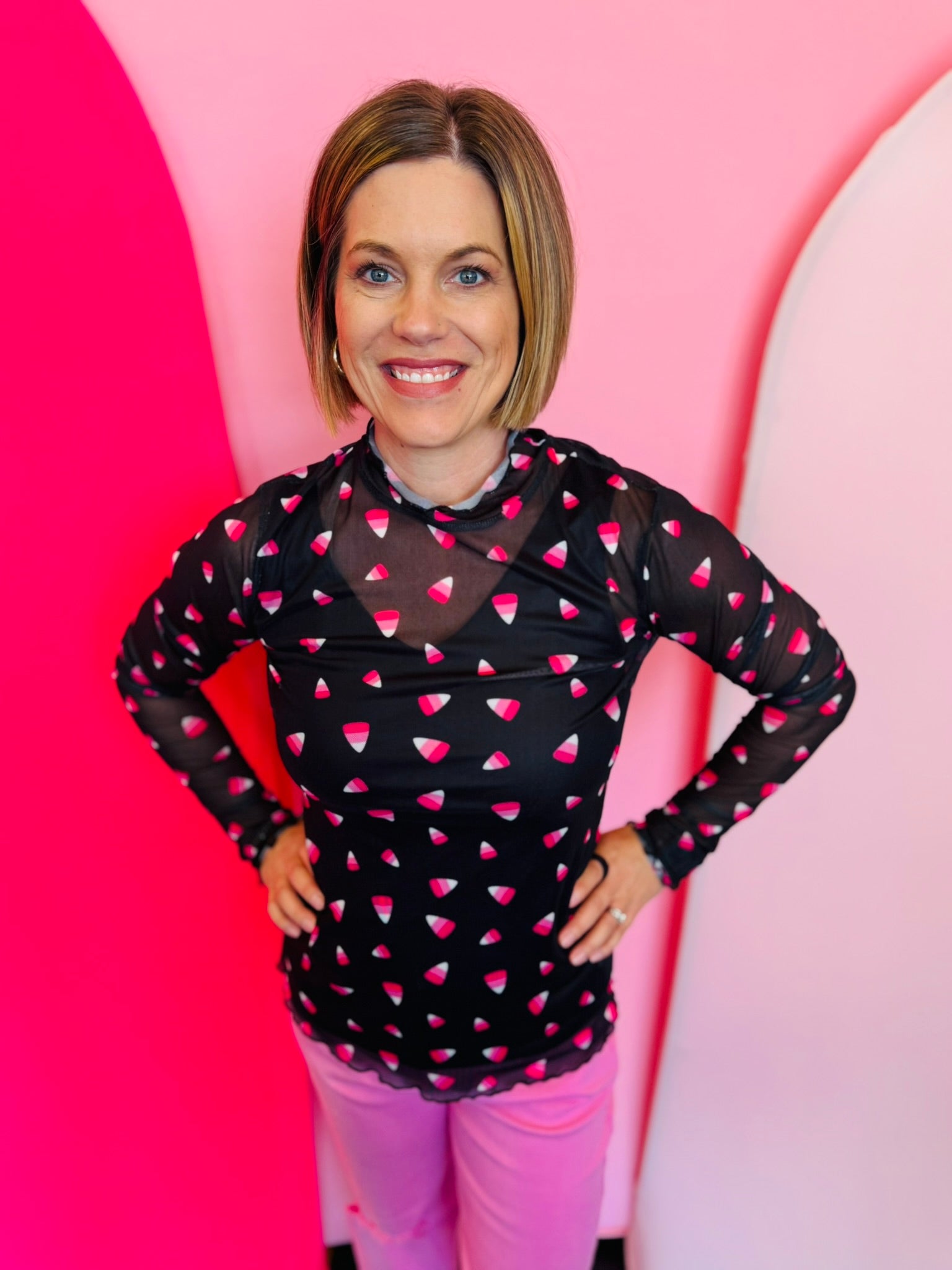 This statement piece is equal parts playful and stylish, featuring a fun pink candy corn print that's perfect for fall festivities. The sheer mesh fabric adds an edgy twist, while the mock neckline and lettuce hem detailing give it a trendy, feminine finish. With its lightweight and stretchy design, this top can be worn over a bralette or layered under graphic tees, sweatshirts, or dresses for a fashion-forward look. Whether you're headed to a Halloween bash or just want to add some seasonal flair to your outfit, this mesh top is a must-have.