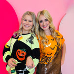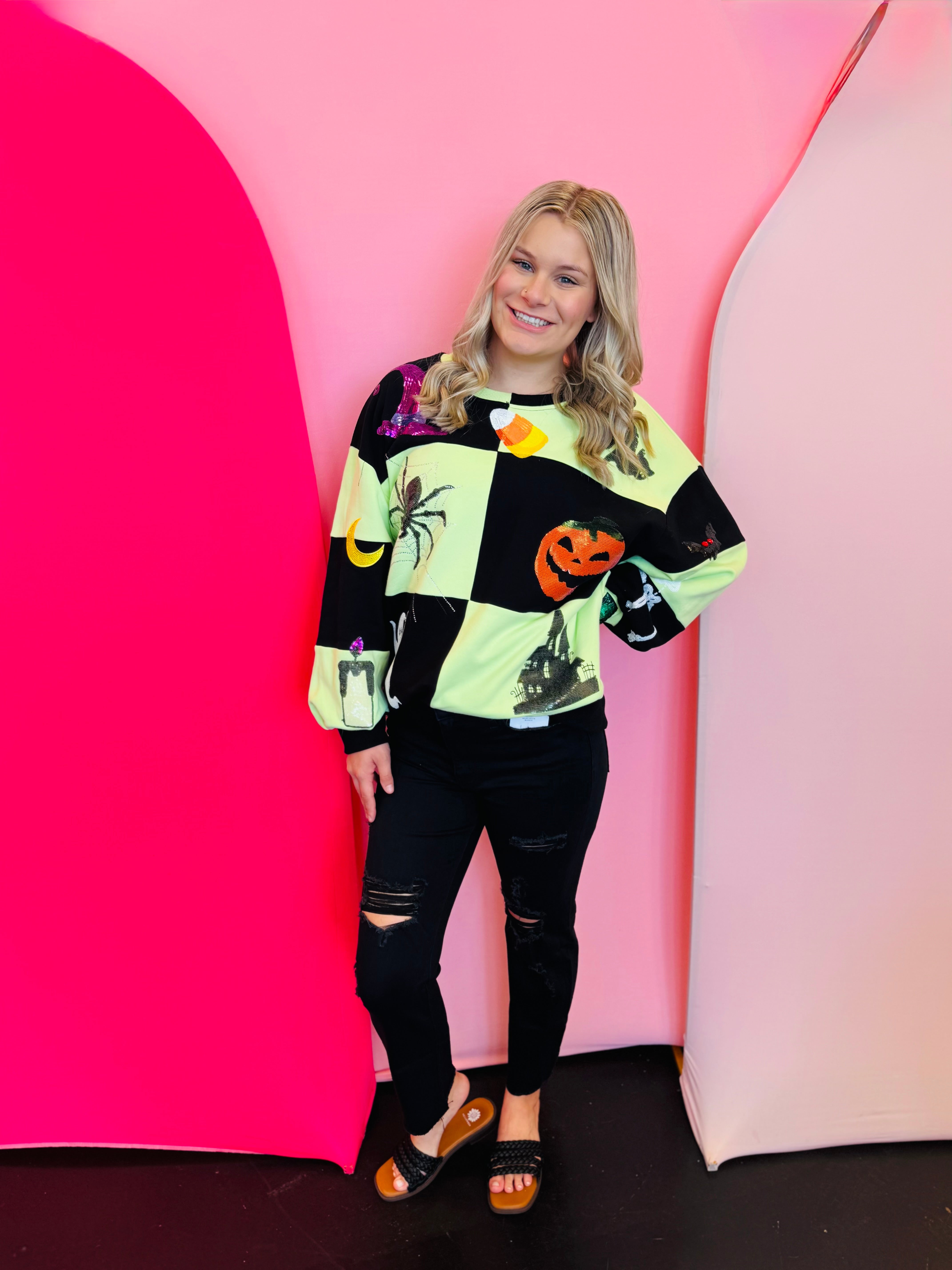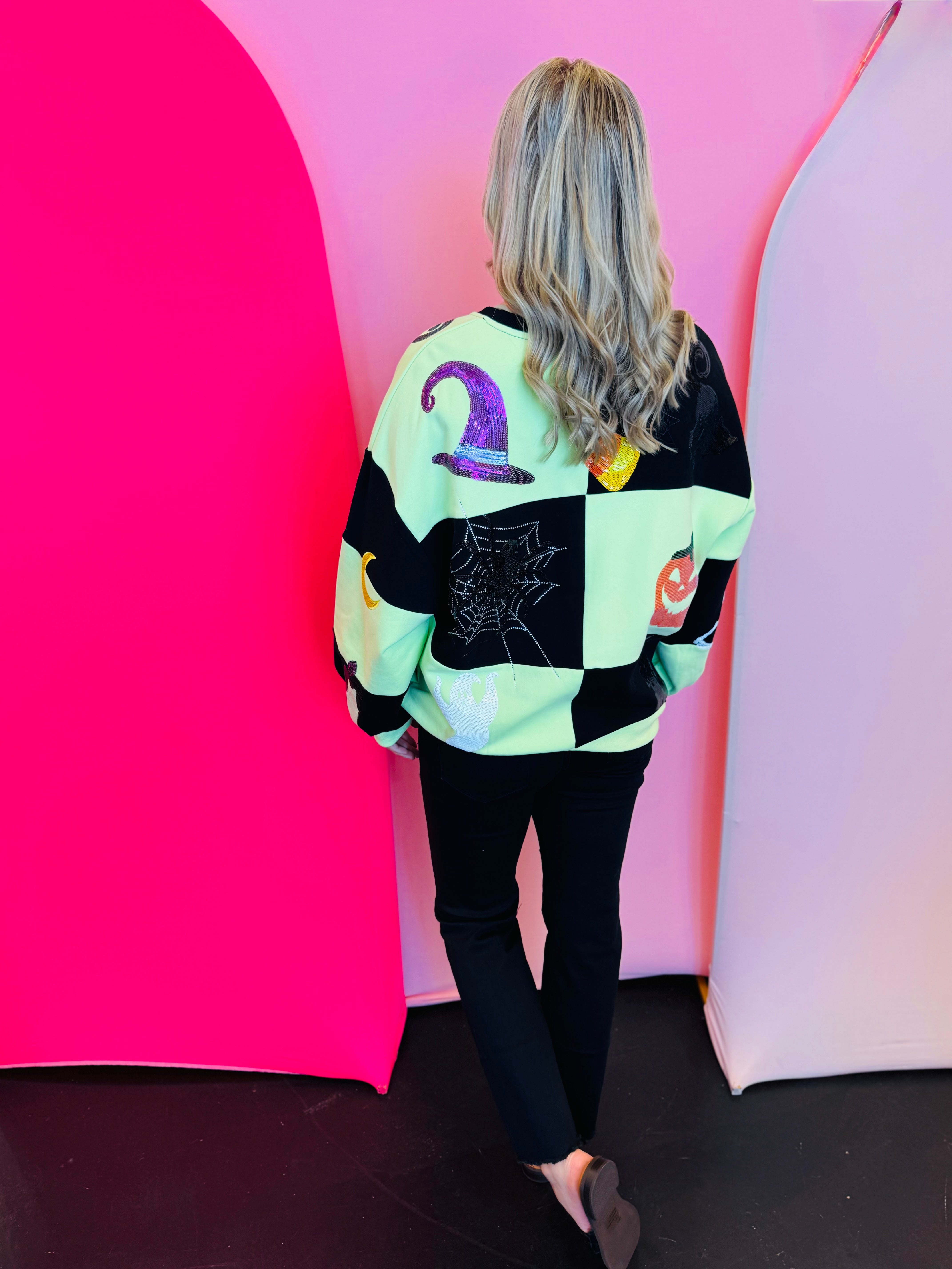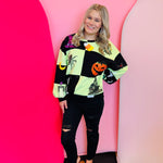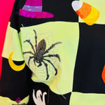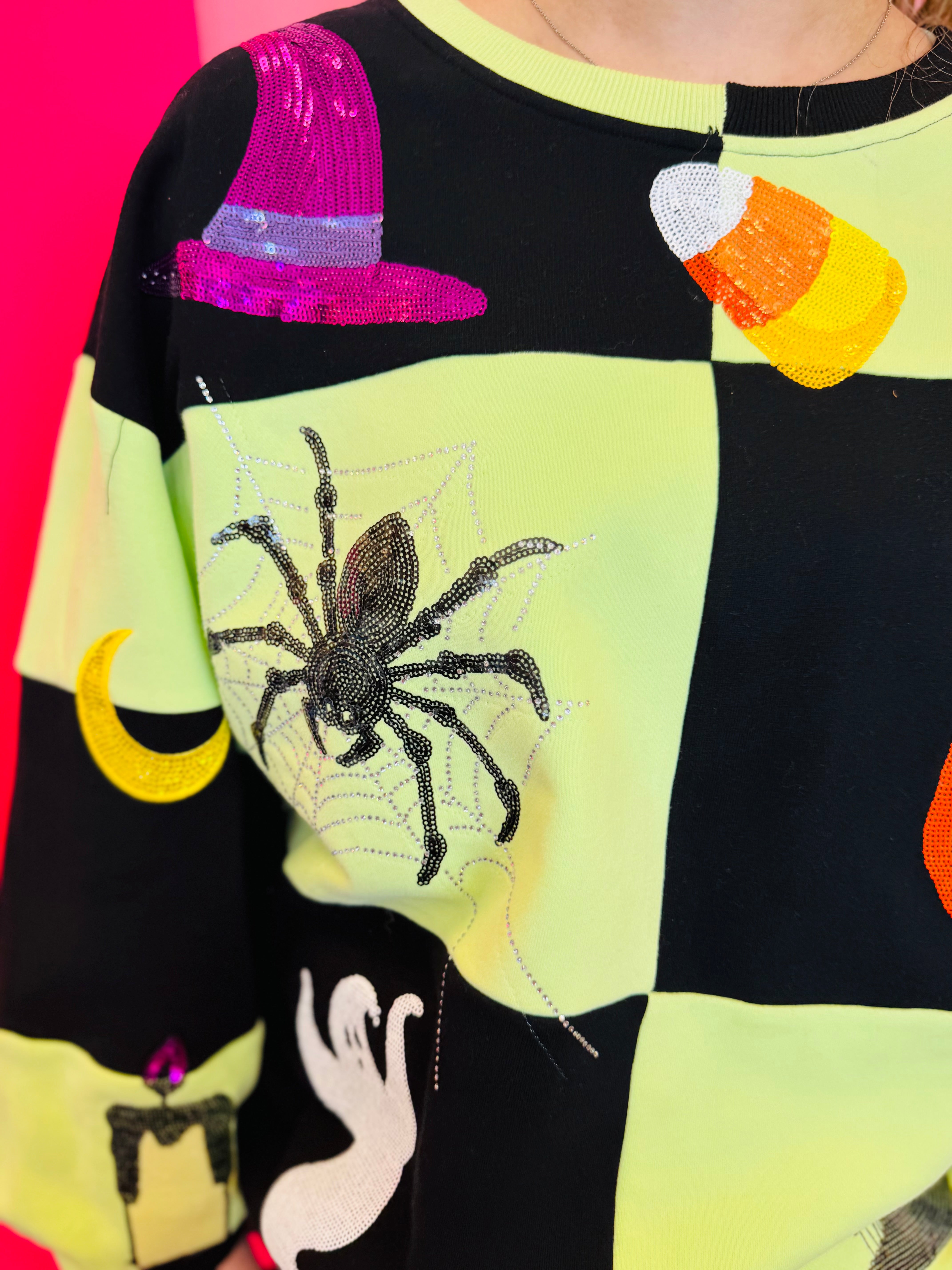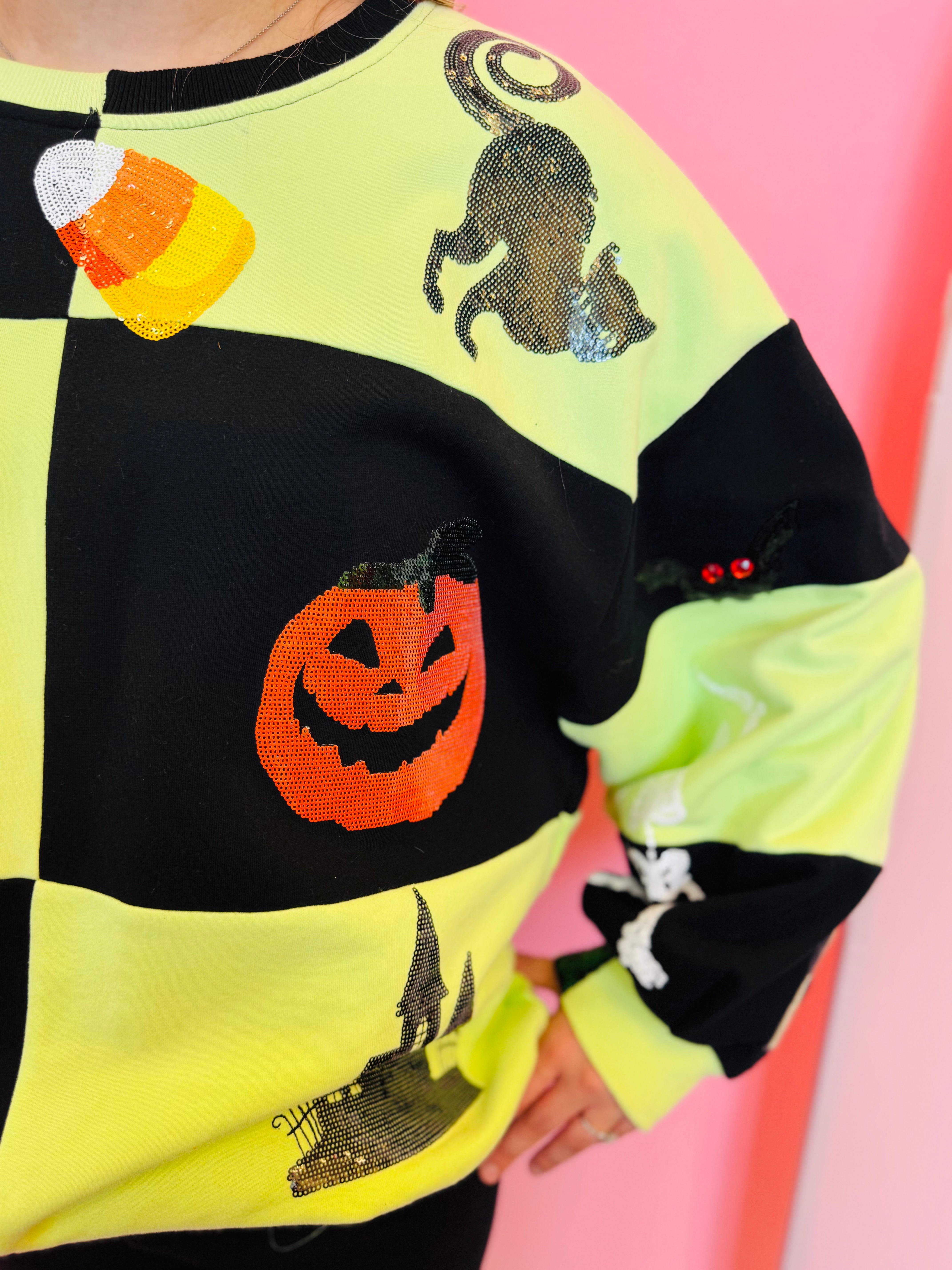 Sparkle your way through spooky season with this Queen Of Sparkles Halloween Icon Sweatshirt. This festive top features a bold, light green and black checkerboard patchwork design, creating the perfect canvas for a dazzling array of Halloween icons. It's lavishly decorated with shimmering, sequined pumpkins, friendly ghosts, candy corn, black cats, witch hats, and more! Crafted from a soft and comfortable blend, this sweatshirt is a true statement piece, perfect for any Halloween party or festive gathering where you want to shine.