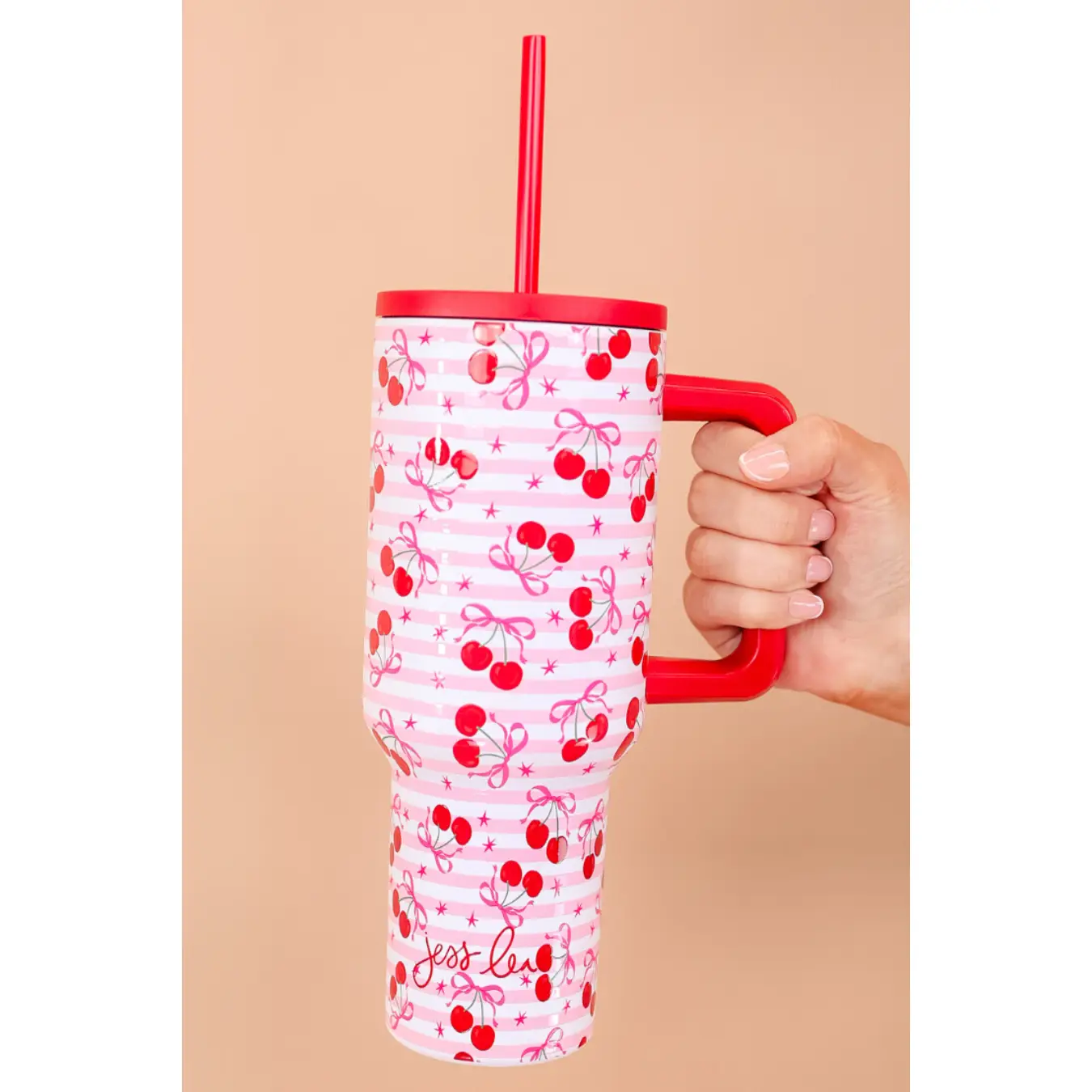Stay hydrated in style with our Cherry Bomb Tumbler! Featuring the prettiest cherry print, this tumbler is perfect for on-the-go sipping. Keep your drinks cool and look good doing it. Add the matching Cherry Bomb pajamas and blanket for a matching set!