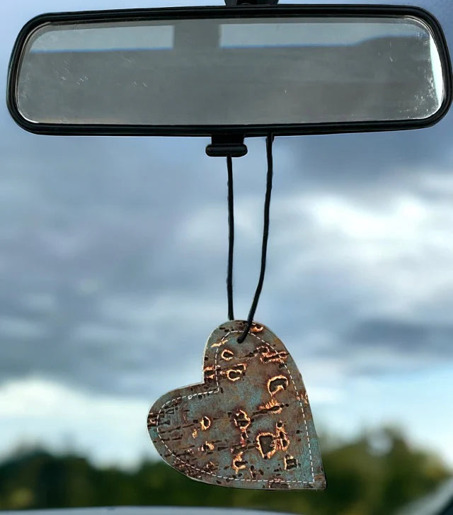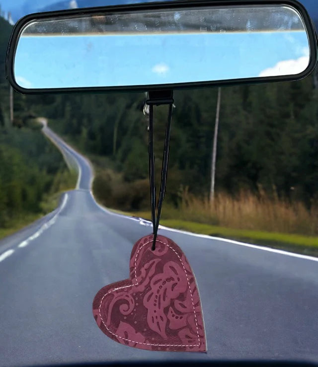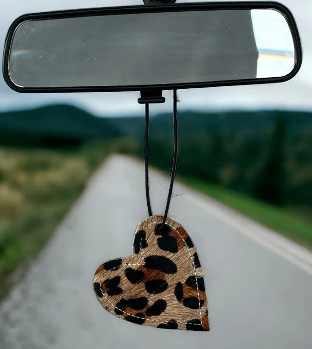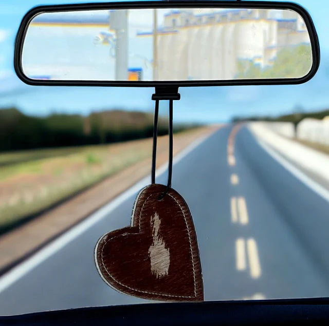 Heart-shaped leather and cowhide car freshener charm, handcrafted, reusable with scented oil mists, ideal for car, home, or camper.