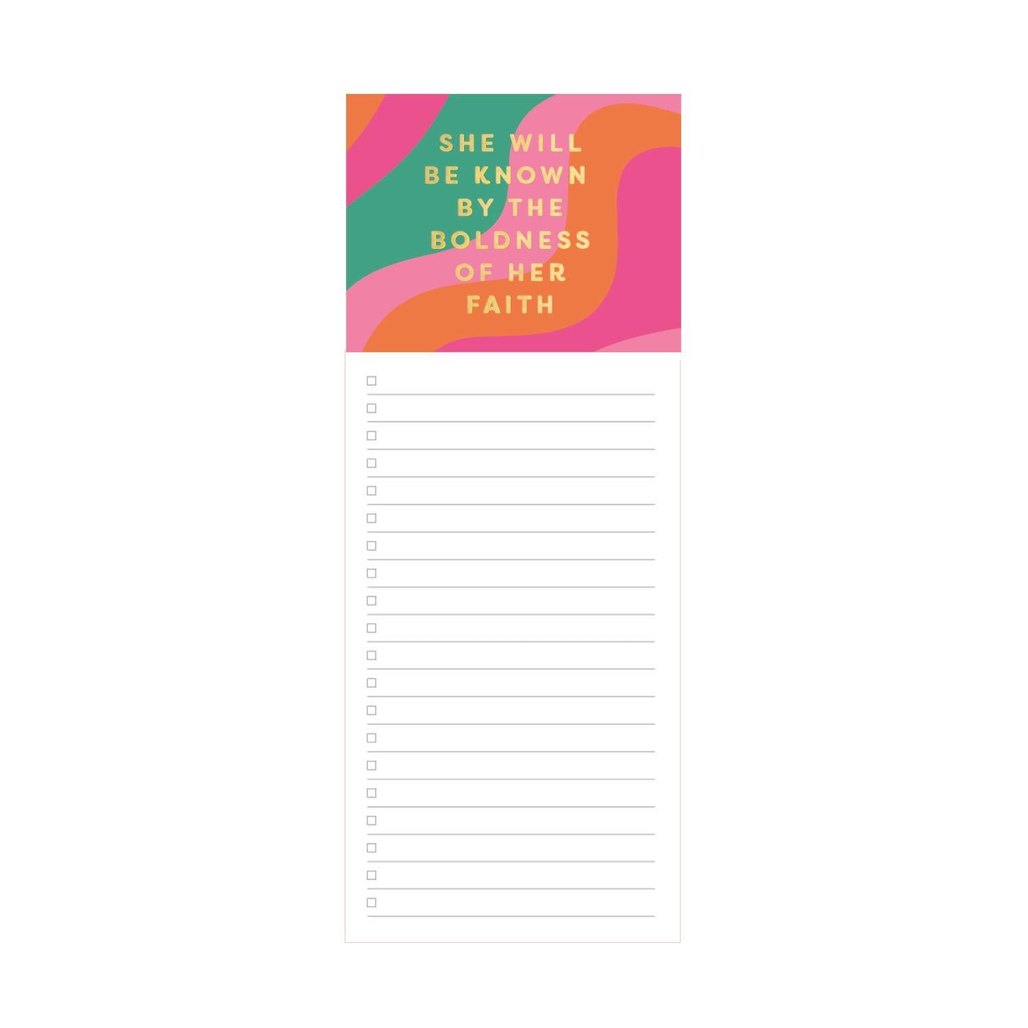 Get inspired with this magnetic notepad, featuring the boldness of her faith. Keep your notes organized and easily accessible while staying motivated. Perfect for those who need a little inspiration with their daily tasks. Faithfully functional!