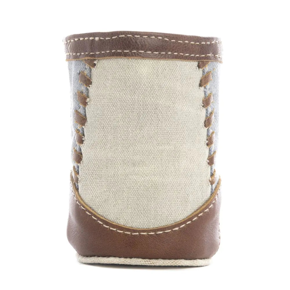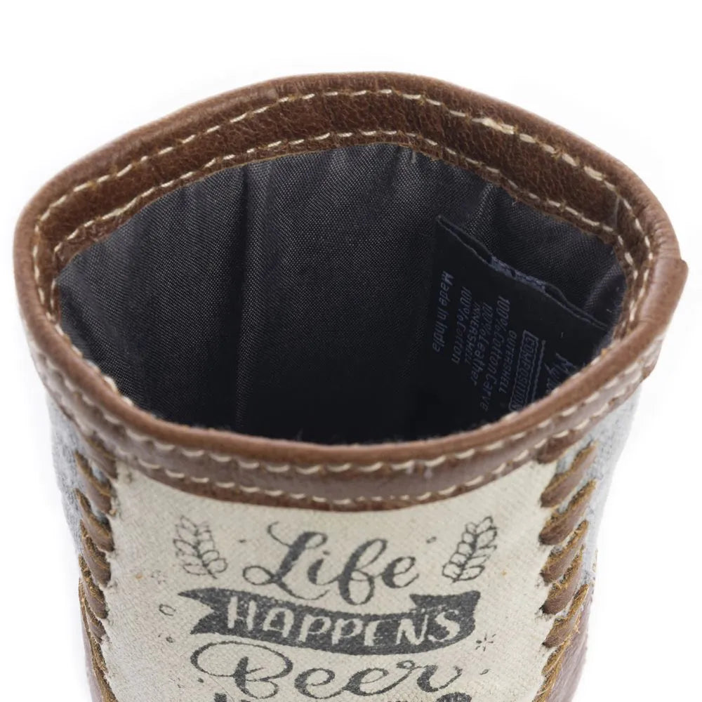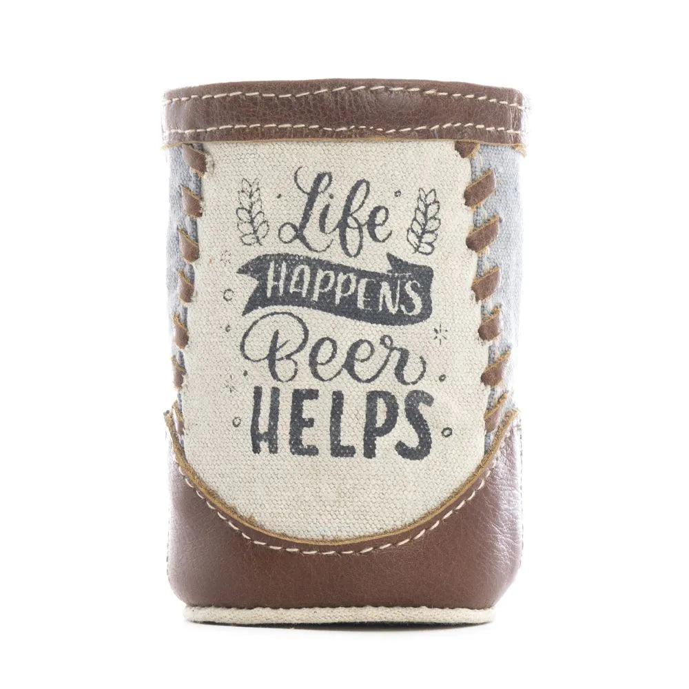 he message is clear: refill if empty! This fun canned beverage holder is made of sturdy upcycled canvas and leather. Whether it's soda, juice or an ice cold beer, this great holder will add function and style to any occasion!