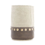 The message is clear: refill if empty! This fun canned beverage holder is made of sturdy upcycled canvas and leather. Whether it's soda, juice or an ice cold beer, this great holder will add function and style to any occasion!