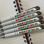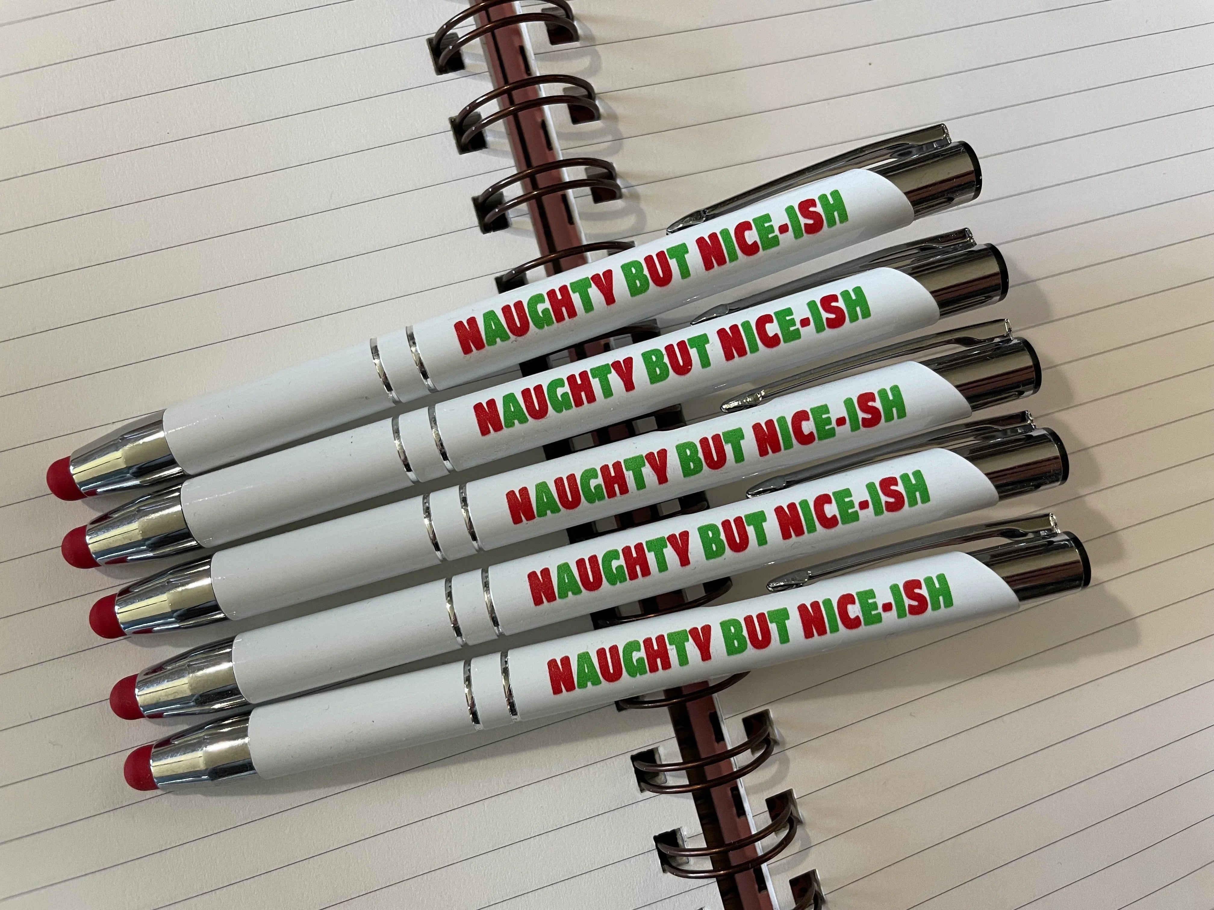 Add a playful touch to your writing with the Naughty But Nice-Ish Pen. This fun white pen features eye-catching red and green lettering. Express yourself in a unique and humorous way with this must-have pen.