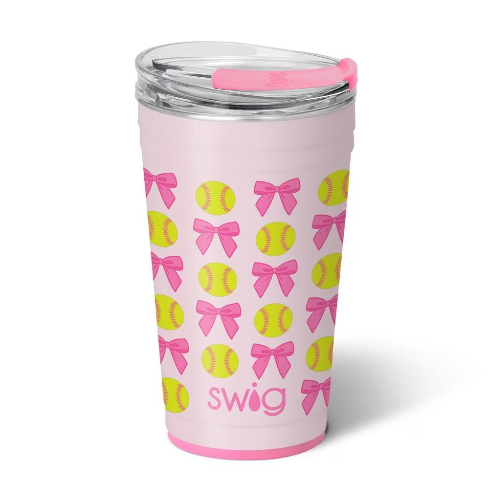 Party-Ready! 🥳🥤 Hit like a girl and show your spirit with fun pink bows and bright yellow softballs! 🥎