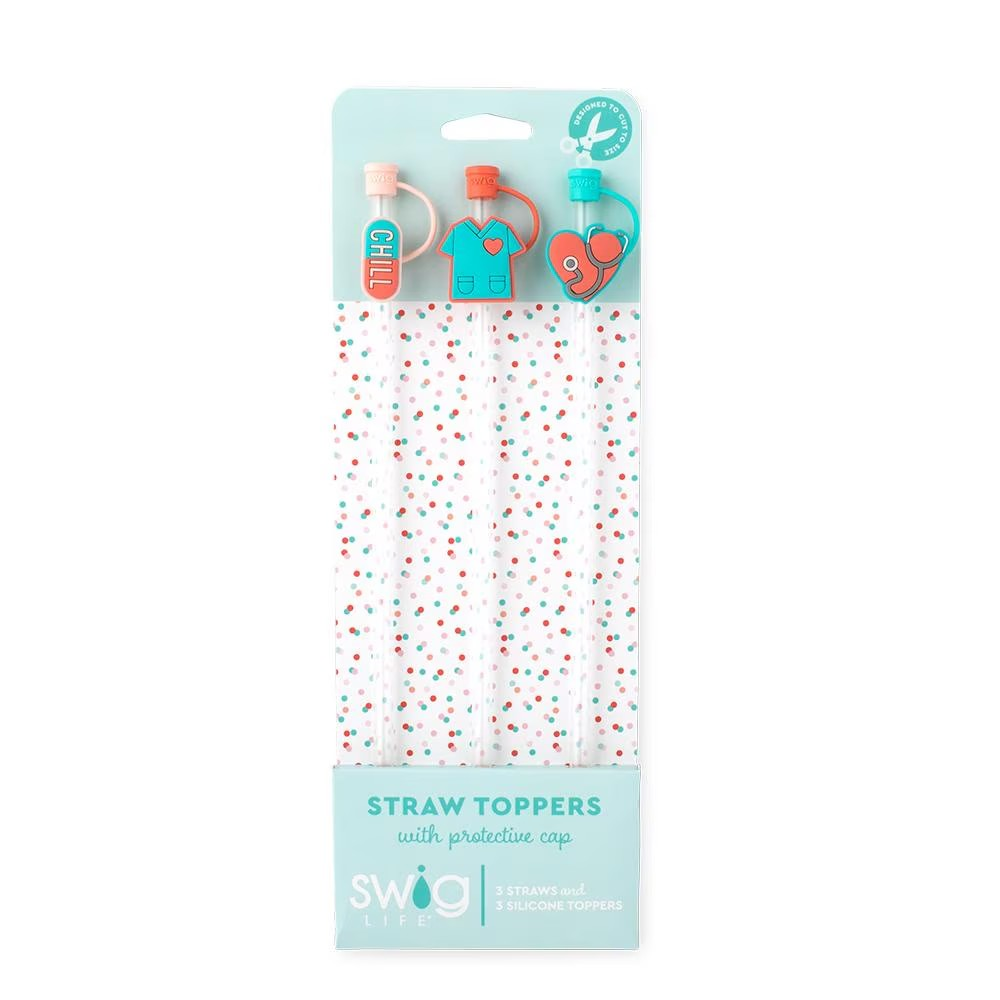 Sip in style and protect your drinks with our Swig Scrub Life Straw Topper Set! This fun and functional set includes 3 reusable straws with cute silicone charms and protective caps. Compatible with Swig tumblers and most other brands. Can be cut to size (with care) and perfect for sharing with friends!