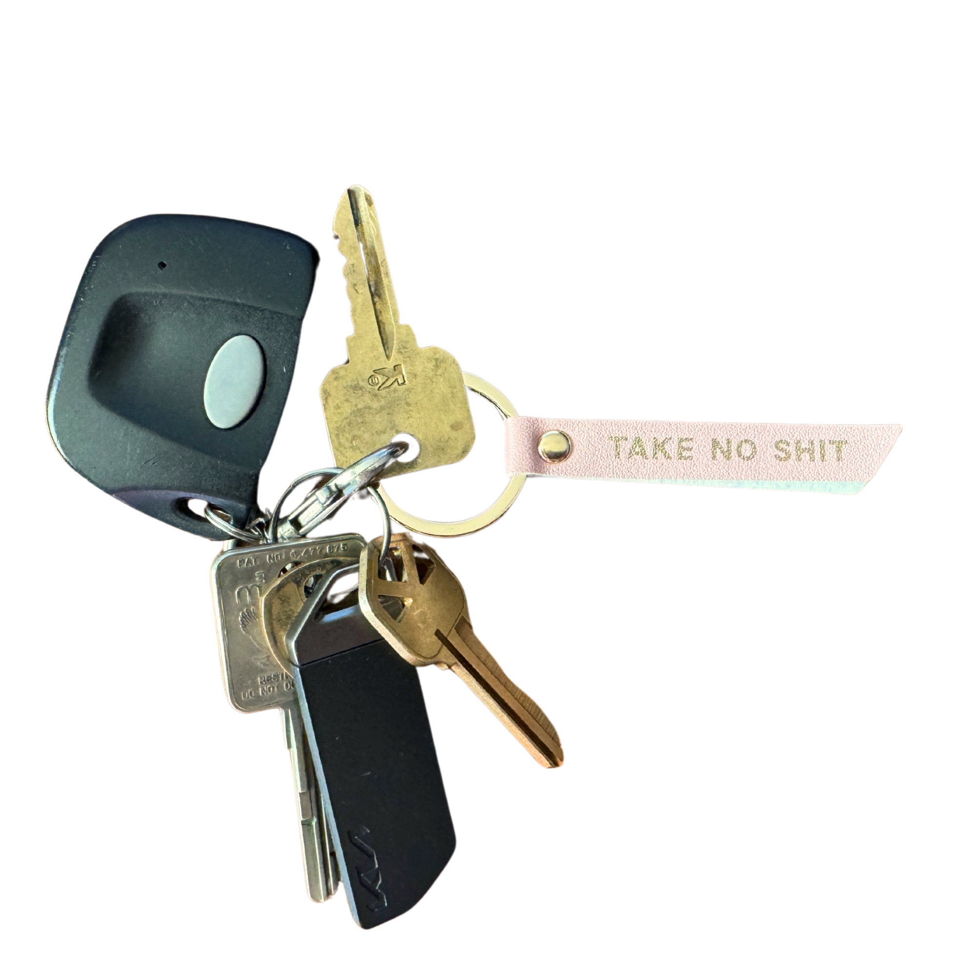 Bubblegum pink vegan leather with gold foil “Take No Shit” graphics