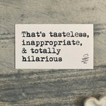 Add some playful and quirky charm to your fridge with our Tasteless and Hilarious Magnet. Perfect for sending snarky messages or adding a touch of humor to your daily routine. Easy to mail, making it a great stocking stuffer or gift. Get yours now!