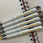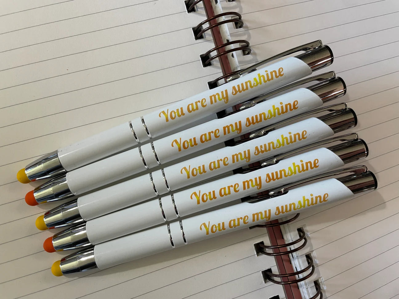 Spread sunshine wherever you go with our You Are My Sunshine Pen! Its sleek metal design, stylish chrome accents, and soft touch finish make it both functional and fashionable. The laser engraved text adds a personal touch, while the black stylus makes it perfect for touchscreen use. Ball point ink ensures smooth writing. Bring on the rays! A witty collection of Pens that are TOP sellers in our store front!