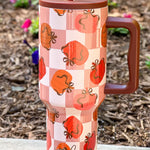 Stay hydrated in festive style with our Harvest Hues Tumbler. This charming 40 oz tumbler is perfect for all your autumn adventures. It features a cute, all-over print of pumpkins and sweet bows, making every sip a little more cheerful. Designed for convenience, it includes a sturdy handle, a secure screw-on lid, and a reusable straw. It's perfectly sized to fit in your car's cup holder, making it ideal for on-the-go. Plus, it's dishwasher safe for easy cleanup.