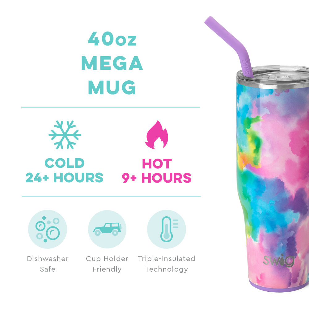 Quench your thirst like never before with the Swig Cloud Nine Mega Mug 40oz! With its double-walled, vacuum-sealed, and copper-plated design, your drinks will stay cold for 24+ hours and hot for 9+ hours. The cup holder-friendly frame and comfort-grip handle make it easy to take on the go, while the fun watercolor print adds a touch of whimsy. Get ready for mega sips and mega chill!