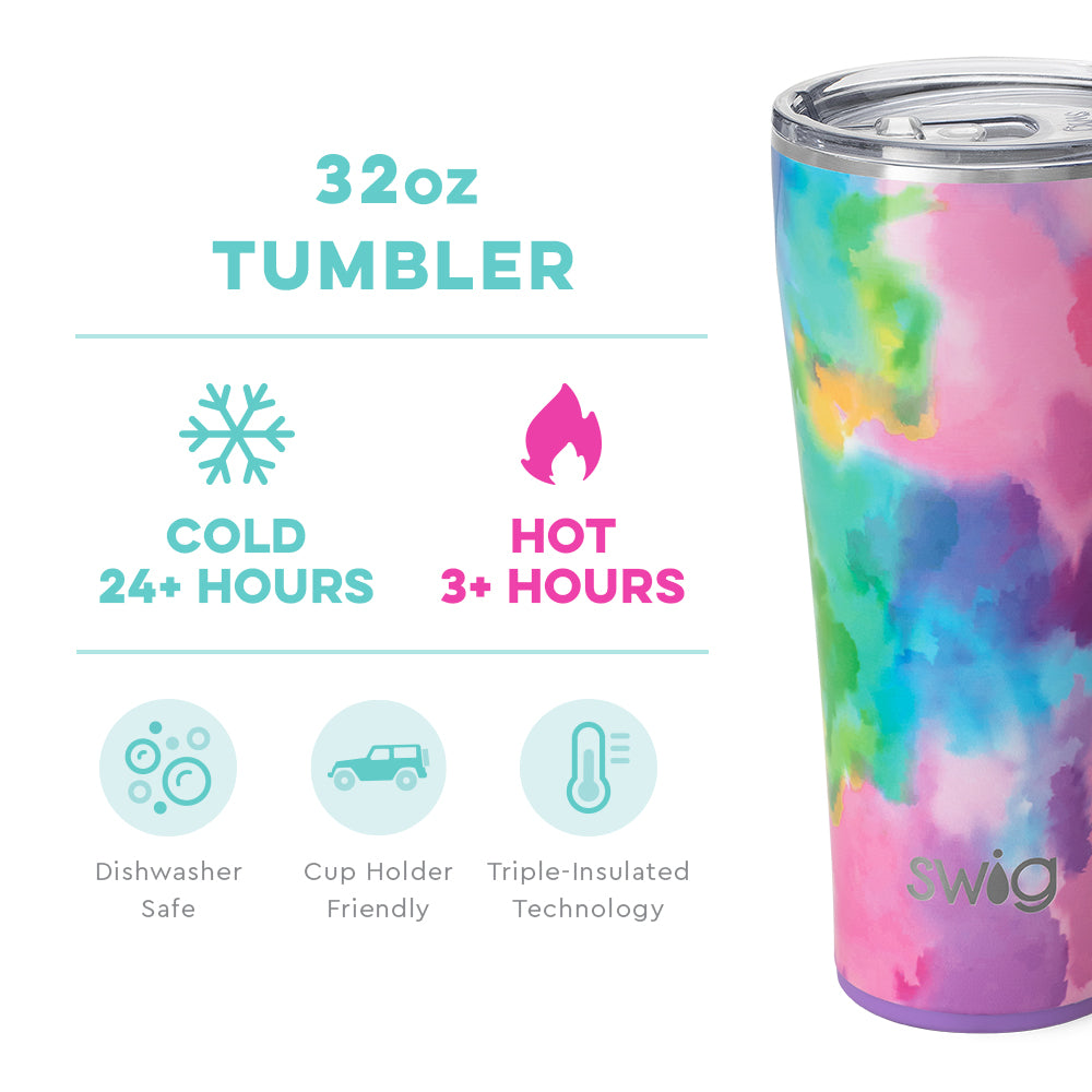 Say goodbye to constant refills with the Swig Cloud Nine Tumbler 32oz! The slim design fits in most cup holders, while the 32oz capacity means more drinks and fewer trips. Made with triple insulation technology, this tumbler keeps drinks cold for 24+ hours and hot for 3+ hours. Plus, it's condensation-free and non-breakable! Dream in the clouds with its watercolor print of blues, purples, and pinks.