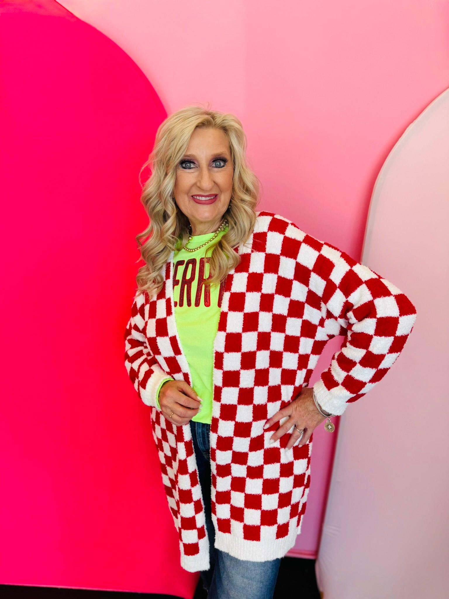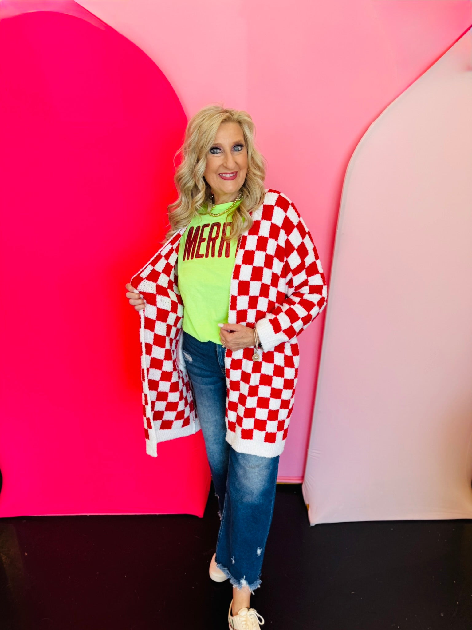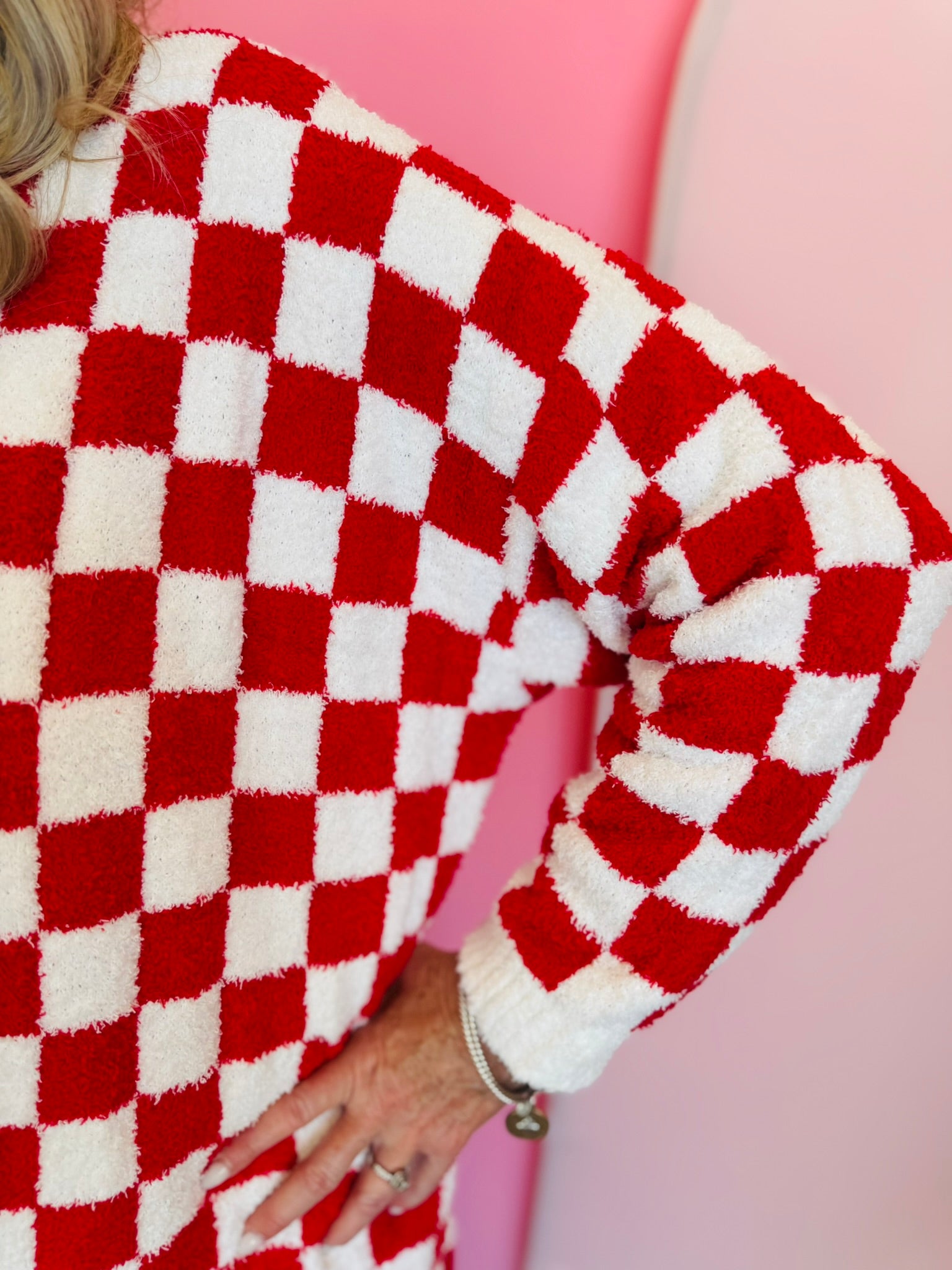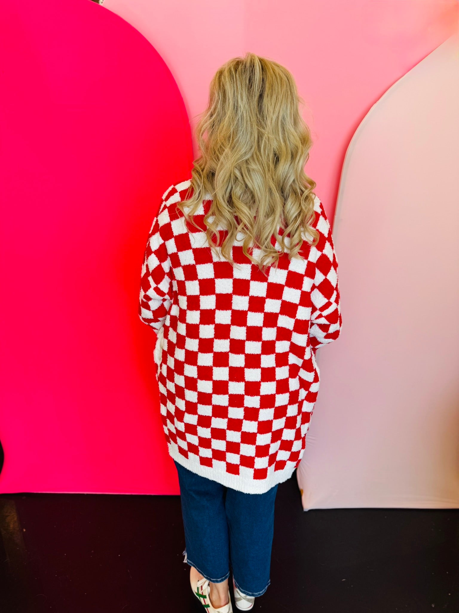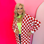 Wrap yourself in cozy style with the Red Checkered Cardigan, a bold yet timeless layer that adds warmth and personality to any outfit. Designed in a classic red and white checkered pattern, this oversized cardigan offers a relaxed fit that drapes beautifully for effortless comfort. Featuring an open front design and convenient front pockets, it’s perfect for layering over tees, tanks, or fitted tops. The longer length provides extra coverage and a flattering silhouette, making it ideal for pairing with jeans, leggings, or dresses. Soft and plush to the touch, this cardigan delivers the perfect mix of comfort and everyday chic—your go-to for cozy winter days or festive holiday gatherings.