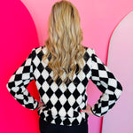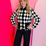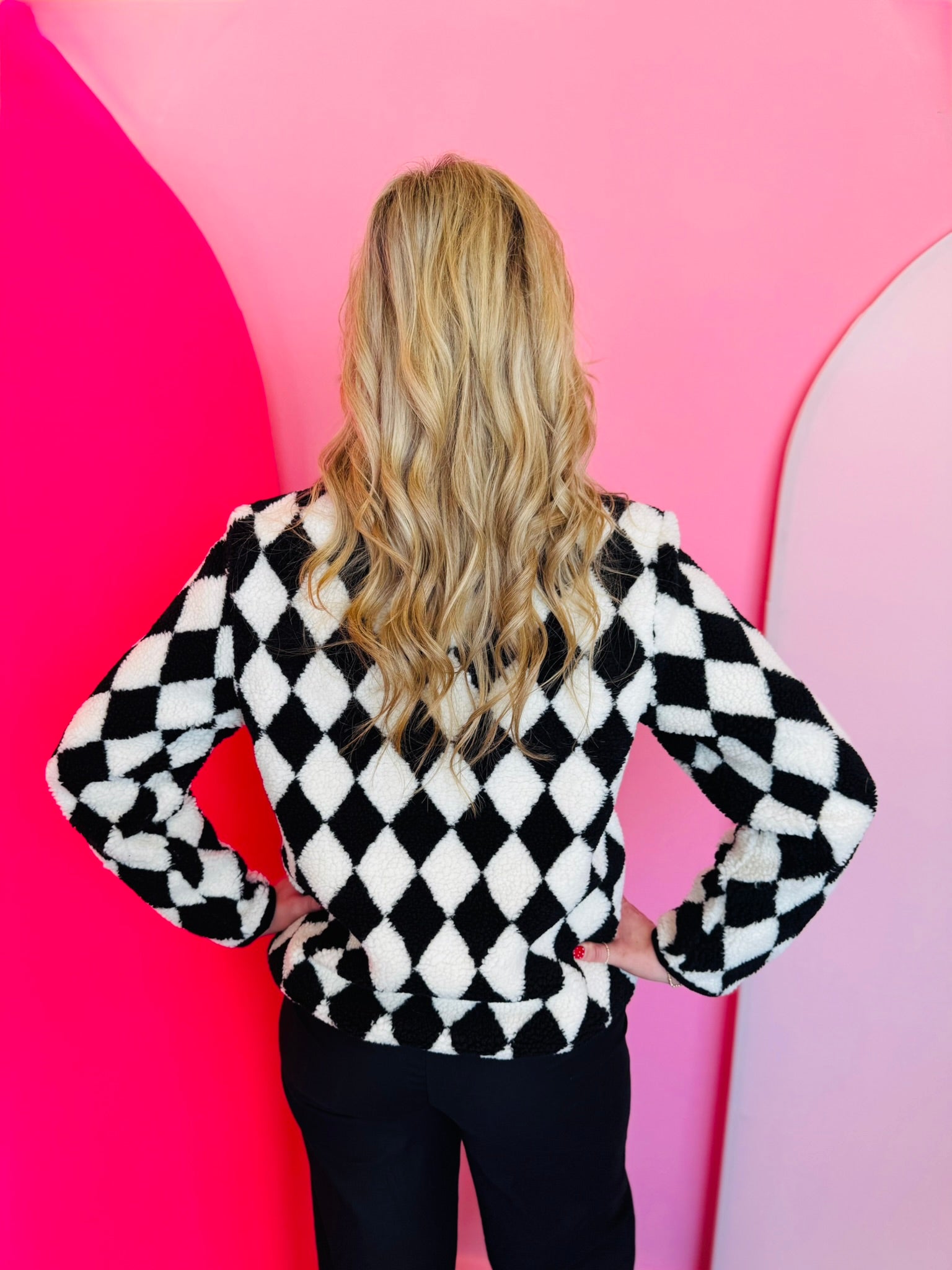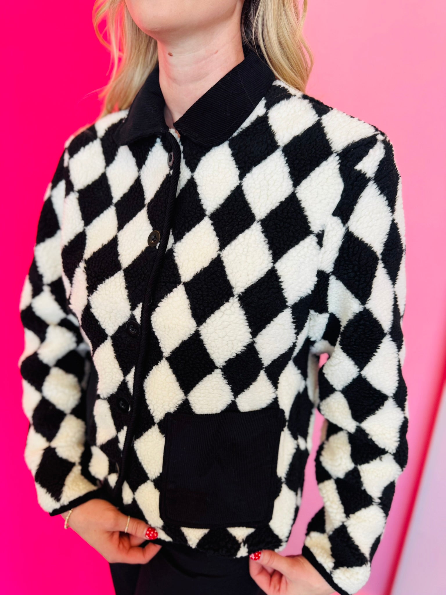 Stay cozy and stylish with the Checkmate Sherpa Jacket, a bold yet timeless layer designed to elevate your cool-weather wardrobe. Made from ultra-soft 100% polyester sherpa, this jacket delivers plush warmth without sacrificing style. The classic black-and-white diamond check pattern creates a striking visual contrast, giving your outfit instant boutique flair.