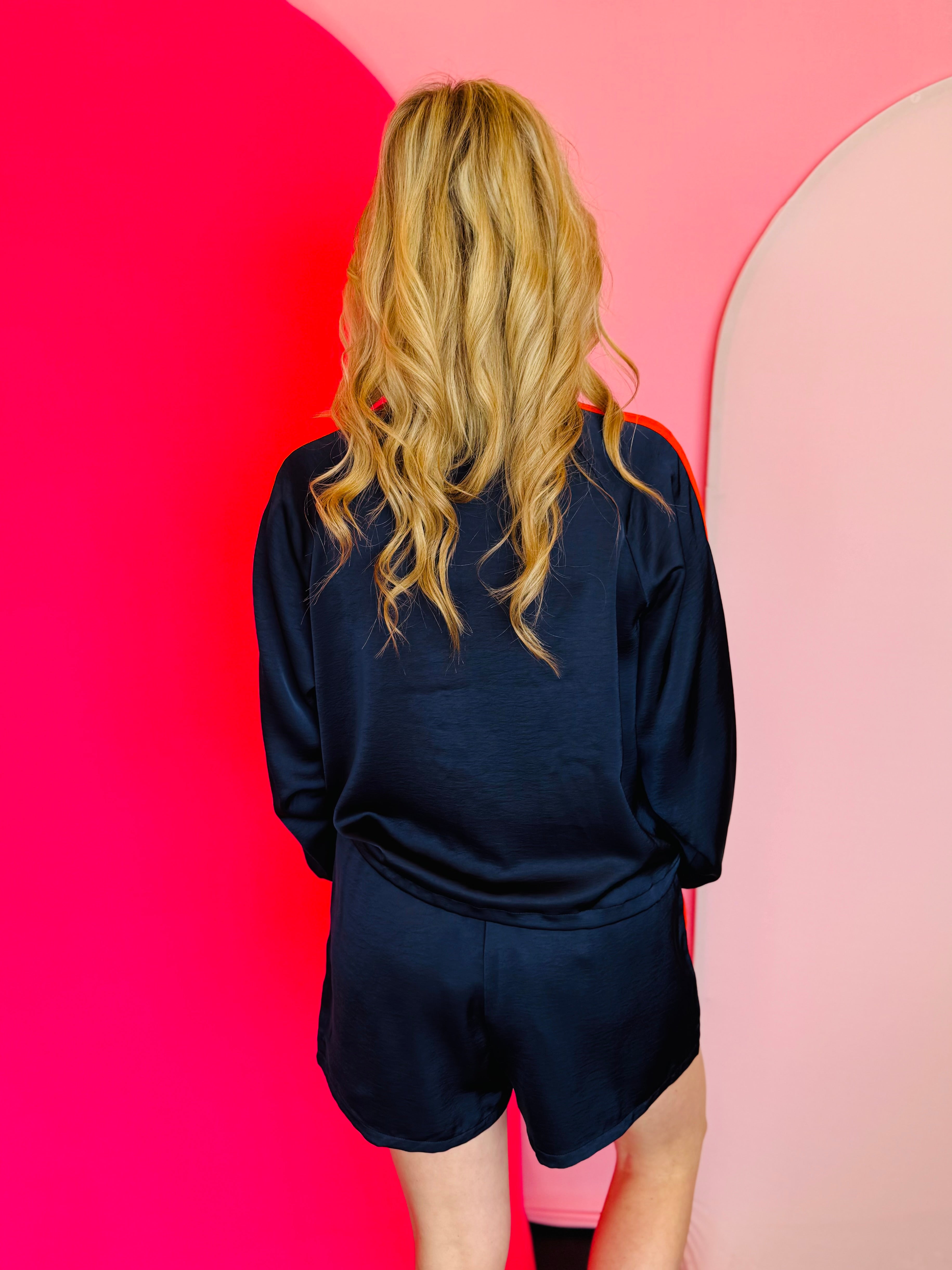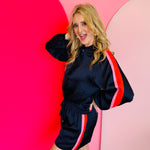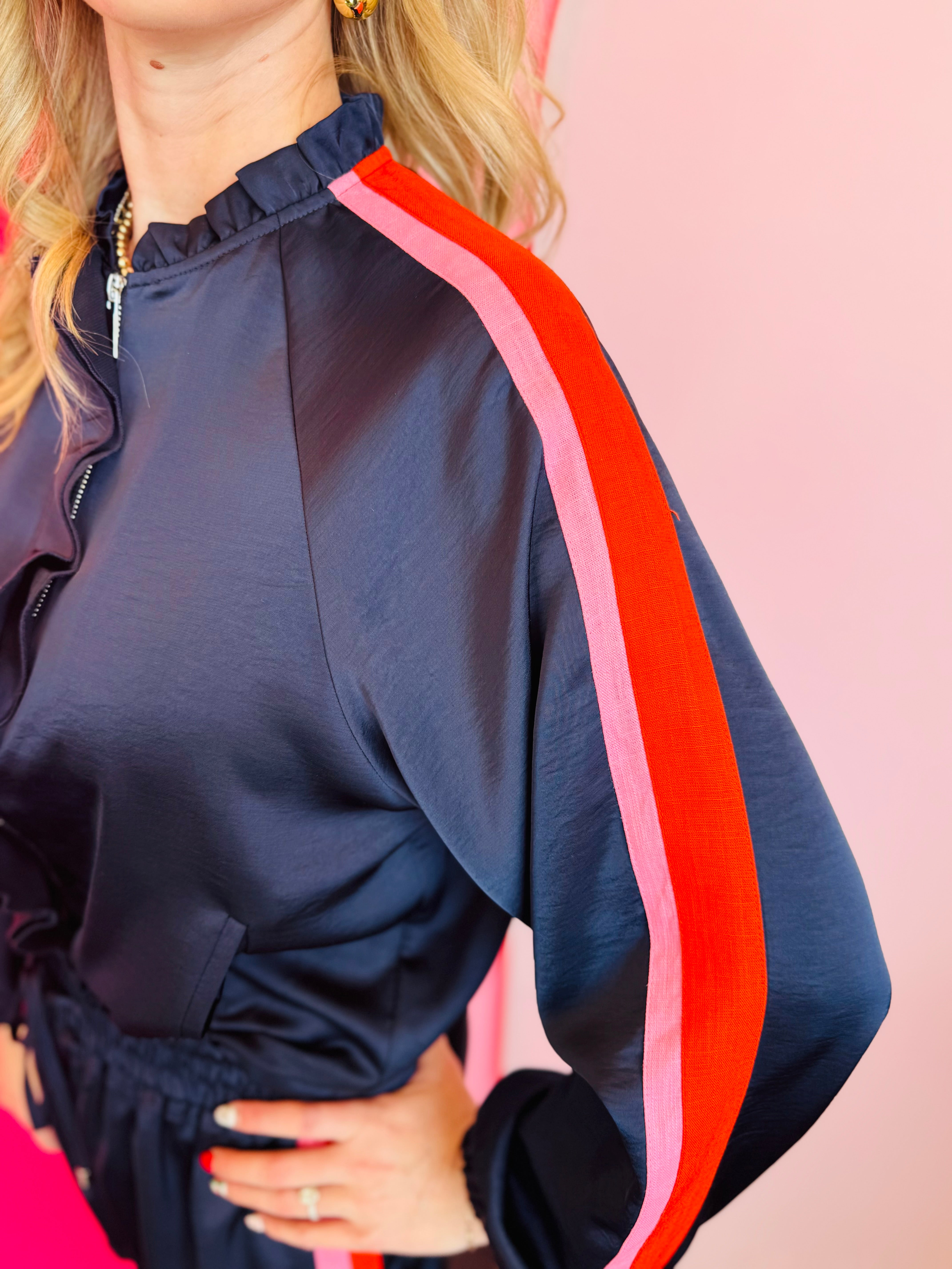 Elevate your athleisure style with our Navy Track Suit Jacket, a polished and feminine take on the classic track silhouette. Made from smooth, easy-care 100% polyester, this jacket features a deep navy hue that pairs effortlessly with activewear or casual street-style looks. A soft ruffle front detail adds a chic, unexpected twist, bringing a touch of boutique charm to an otherwise sporty layer. Racing stripes down the sleeves provide bold contrast and athletic edge, while the zip-front closure and functional pockets keep the design practical and versatile. Whether you're headed to the gym, running errands, or styling it for a casual day out, this track jacket delivers comfort, personality, and effortless cool—all in one sleek piece.