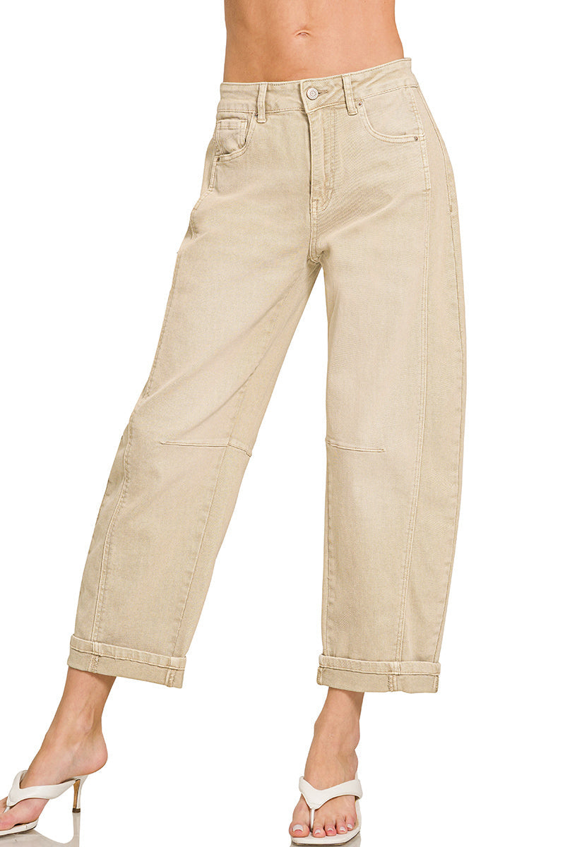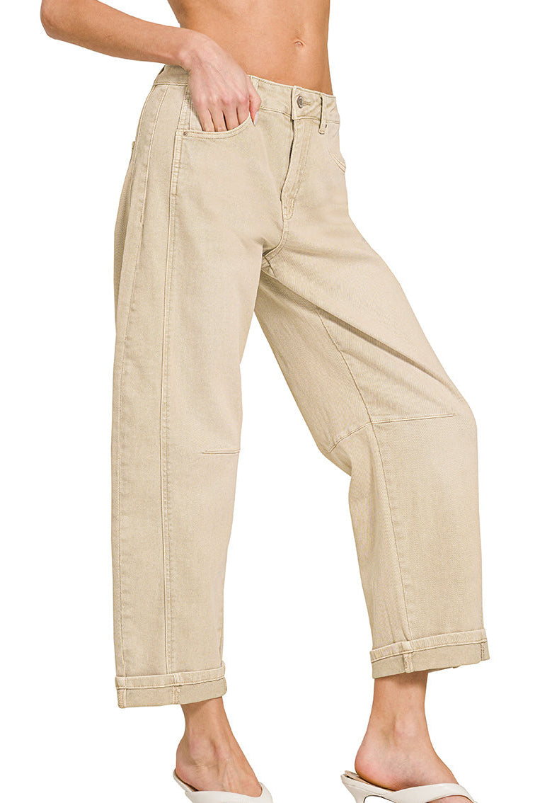 Bring soft, neutral elegance to your everyday style with the Sand Beige Cropped Barrel Pants, a modern wardrobe staple designed for comfort, structure, and effortless versatility. Crafted from a breathable cotton-spandex blend, these high-waisted pants offer gentle stretch while maintaining a polished, fashion-forward silhouette. The relaxed barrel-leg shape tapers subtly toward the ankle, creating a flattering fit that feels both contemporary and easy to wear, while the cuffed hem adds a chic, cropped finish.
