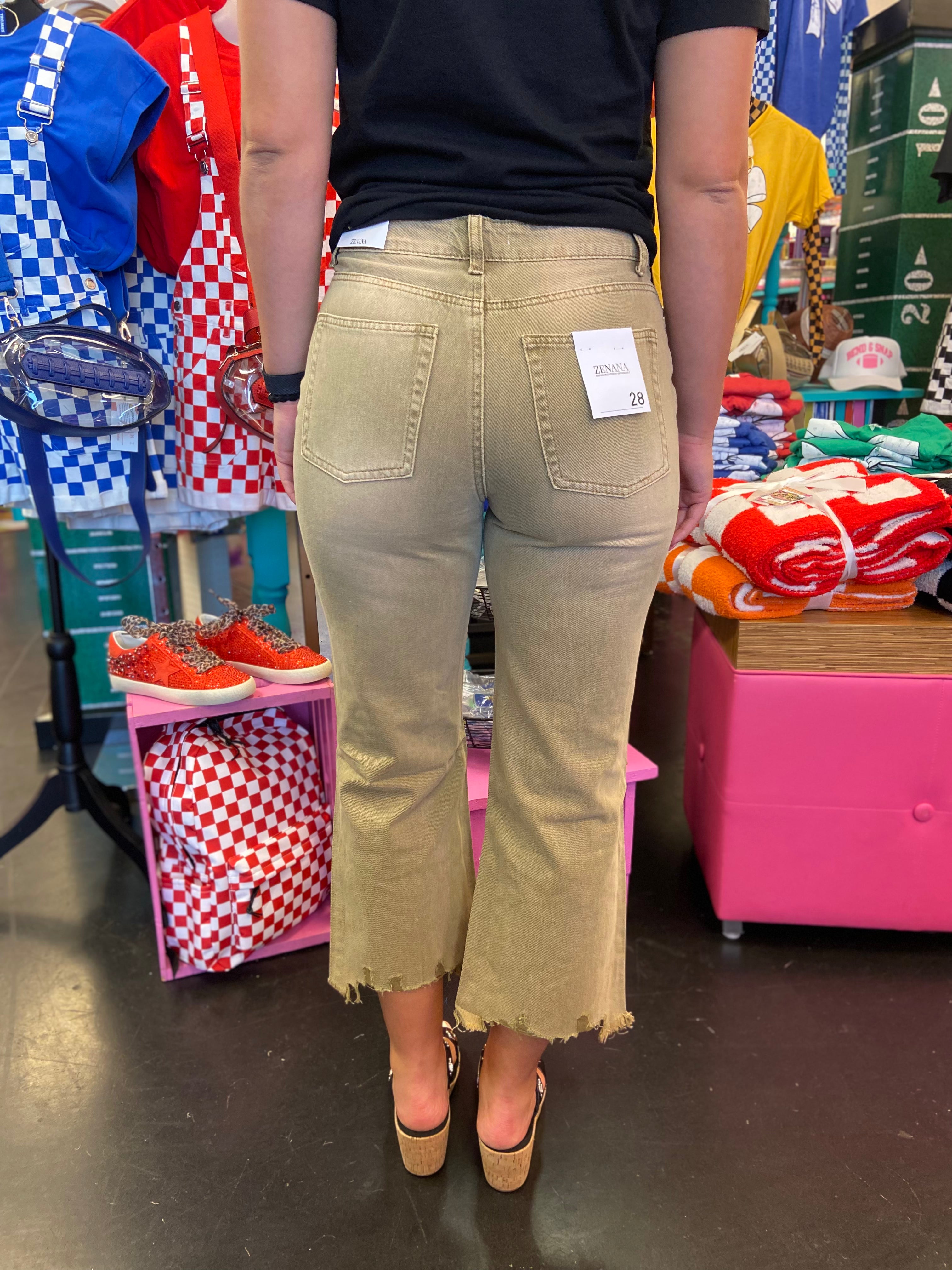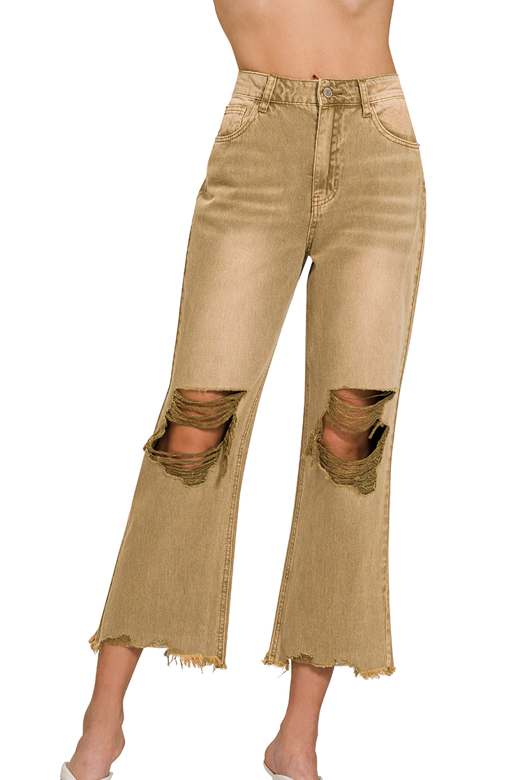 These fashion-forward cropped jeans blend casual comfort with edgy style. Designed in a light camel wash that stands out from the usual denim shades, they feature artfully distressed knees and raw hems for a worn-in, laid-back vibe. The cropped fit flatters your frame and highlights your favorite sneakers, heels, or boots. Whether you’re heading out for coffee or dressing them up for a casual dinner, these jeans are your go-to for effortlessly cool looks.