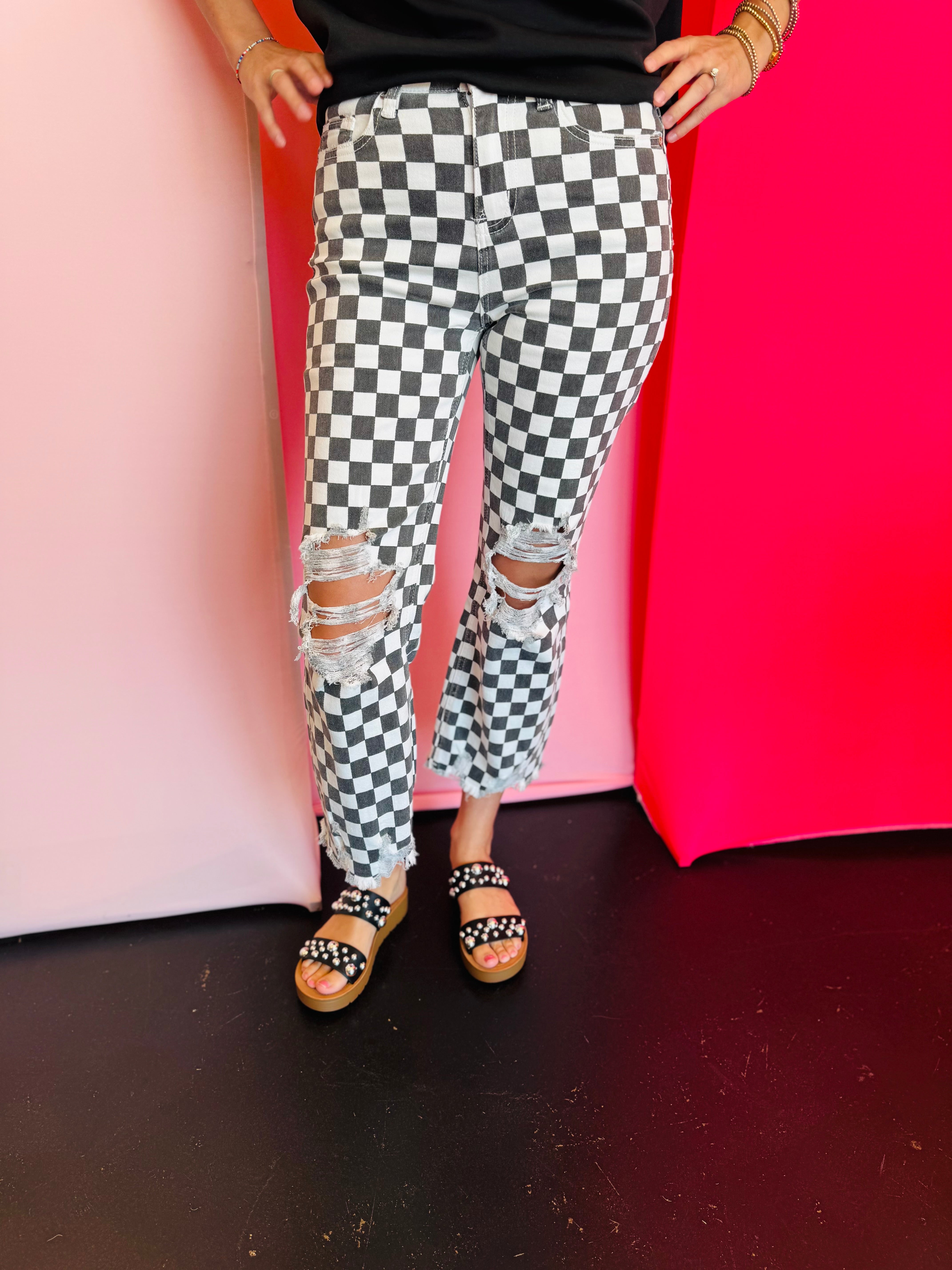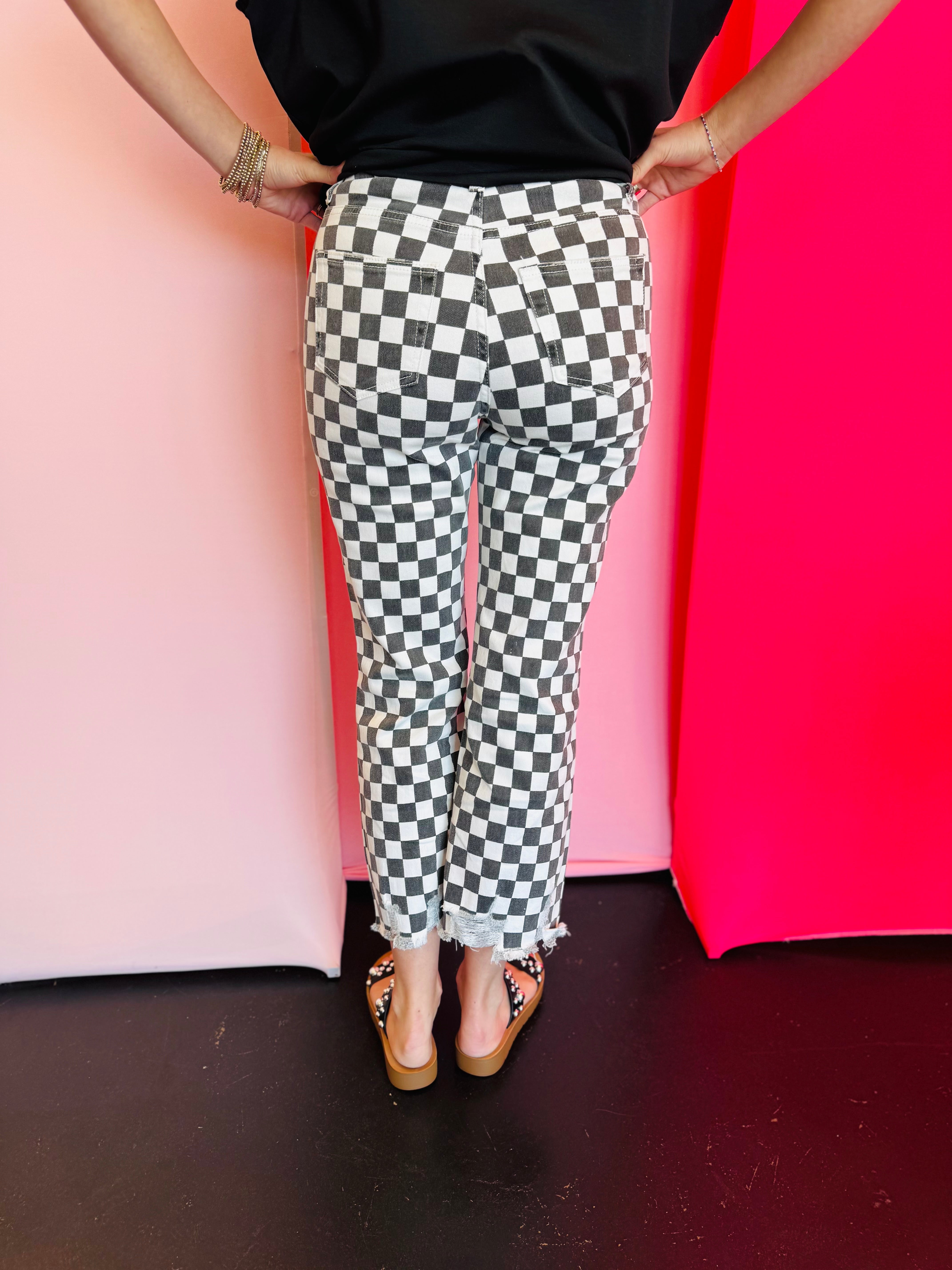 Checkered print is the trendiest look going now! Upgrade your style with these jeans! Think perfect addition to your game day or holiday look!