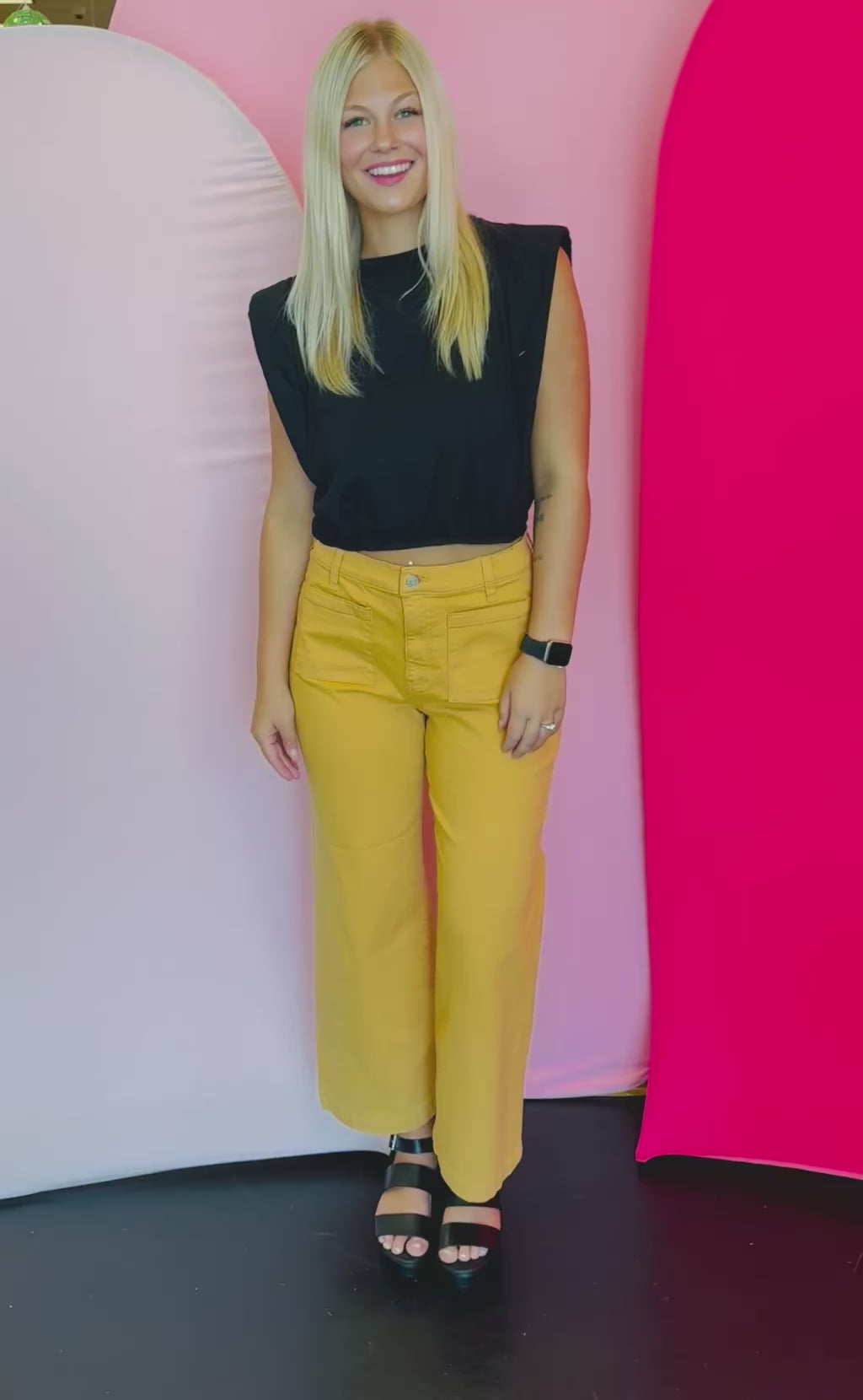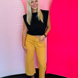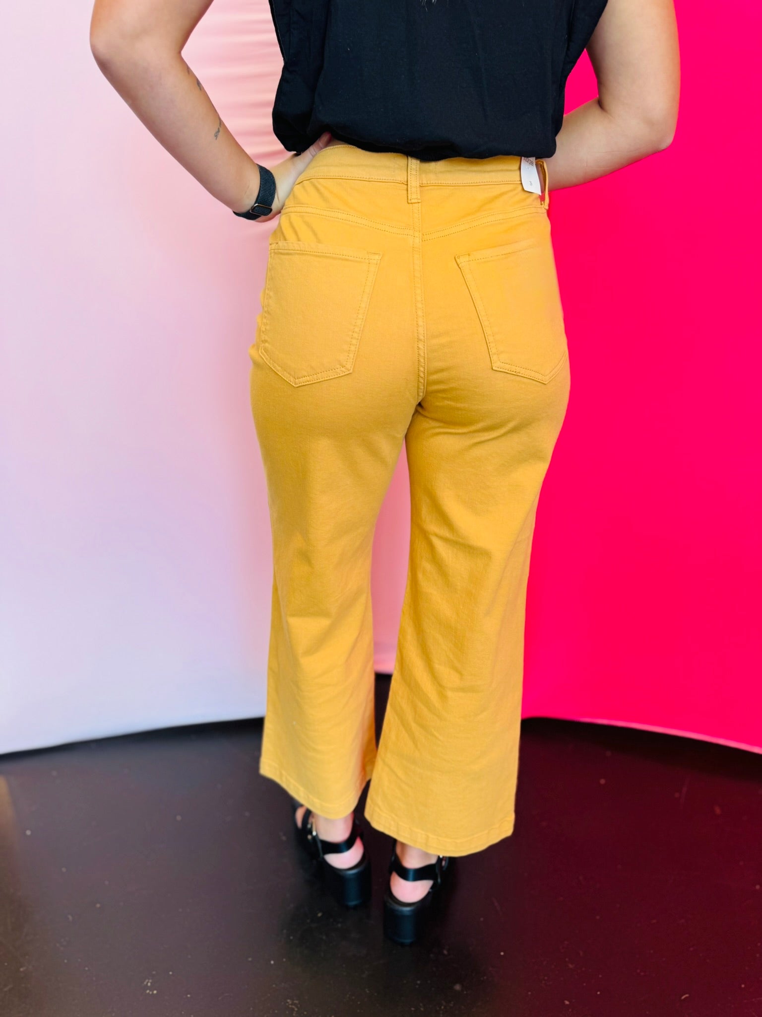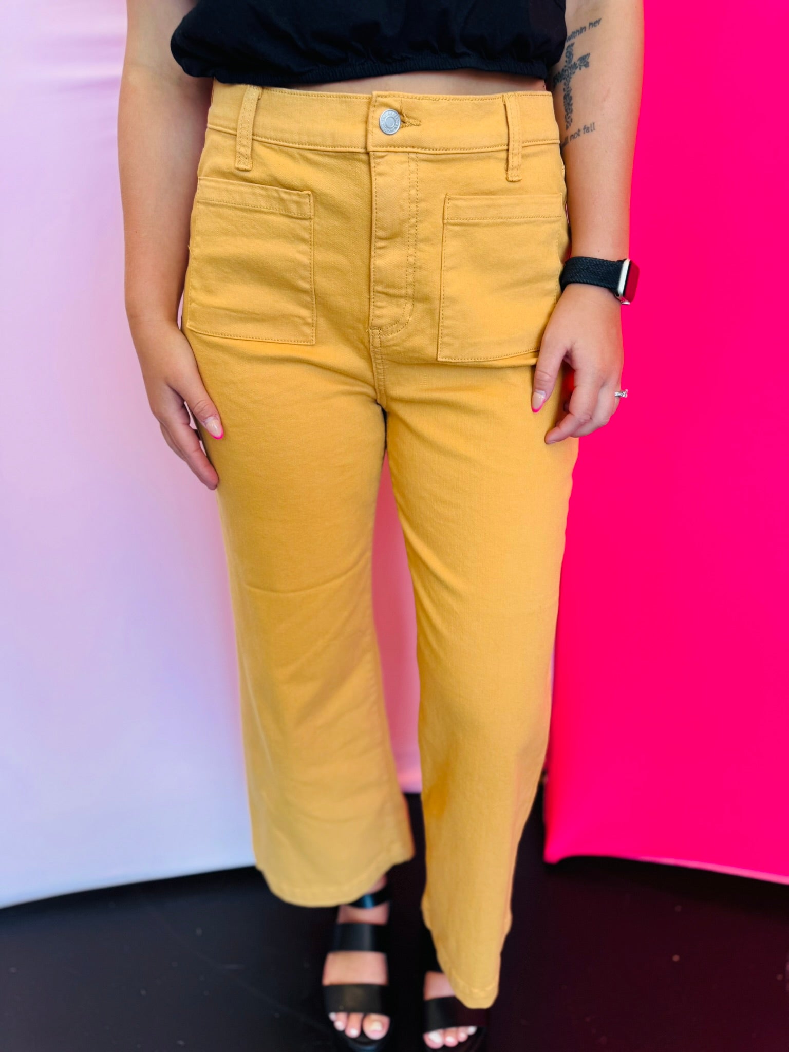 Shine bright and stand out in the Inca Gold Crop Wide Leg Jeans—a bold blend of style, comfort, and versatility. Featuring a flattering high-rise waist, these jeans elongate your silhouette while offering a comfortable, secure fit. The wide-leg cut adds a modern, on-trend vibe that’s easy to style for both casual and elevated looks. Crafted from a premium blend of 65% cotton, 31% rayon, 2% Elasterell-P, and 2% spandex, they deliver the perfect balance of softness, structure, and stretch for all-day wear. Two spacious front pockets give you just the right amount of function to carry your essentials without sacrificing style. With their rich gold hue, cropped length, and relaxed yet polished design, these jeans are a statement piece that turns every outfit into treasure.