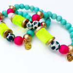 Add a pop of color and fun to your look with this playful beaded bracelet. Featuring a vibrant mix of aqua, fuchsia, black, white, gold, and neon yellow beads, including our signature Audra Style™ print beads and AS brand charm. Stretchy and comfortable, it fits most wrists at approximately 7.75 inches. Perfect for layering or wearing solo to brighten any outfit!