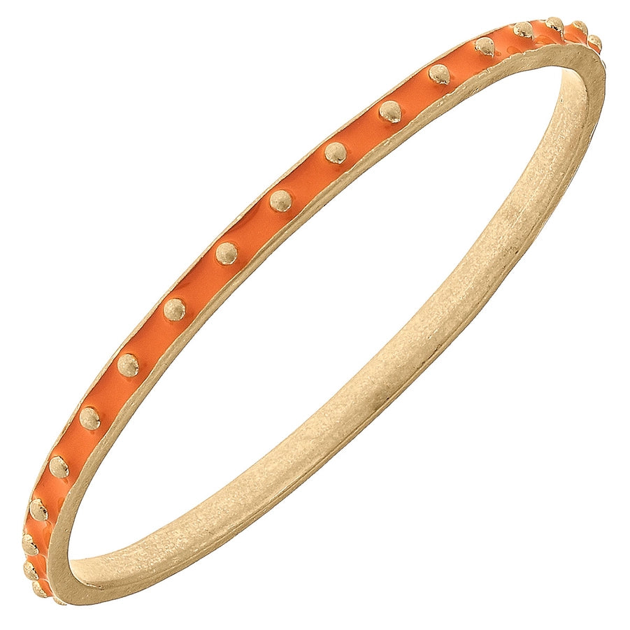 This statement bracelet is the perfect addition to any outfit. Crafted with base metal and worn gold plating, this piece stands out with enamel material and a stunning orange hue. Dare to be bold with this 3" diameter bracelet!