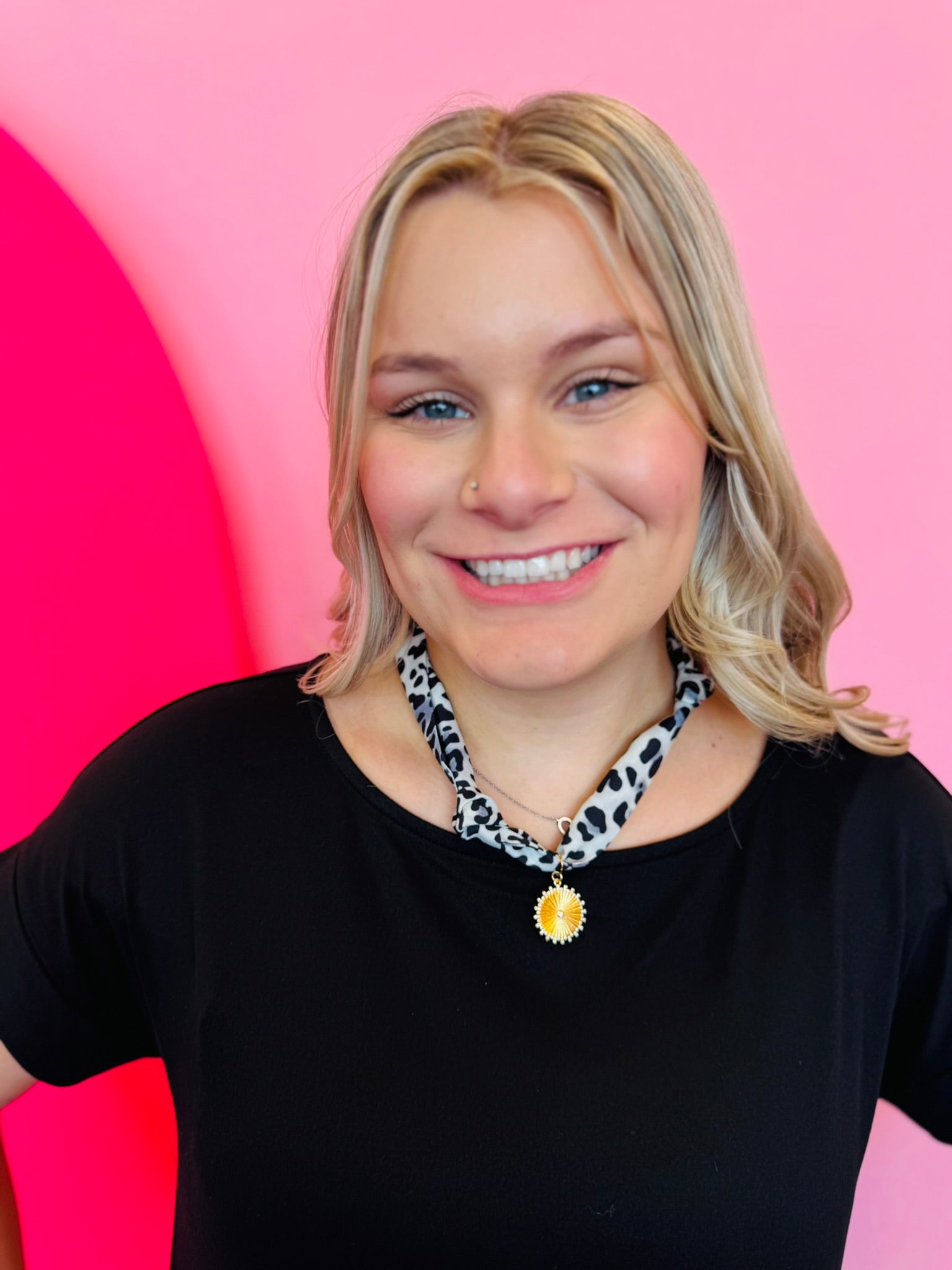 Add bold glamour to your accessory game with our Black and White Leopard Print Satin Scarf Necklace, a statement piece that blends timeless animal print with chic sophistication. Crafted from smooth, lightweight satin, this scarf features a striking black and white leopard pattern that instantly elevates any outfit. Knotted into a stylish necklace, it’s finished with a gold starburst medallion charm, adding a touch of radiance and elegance to the design.